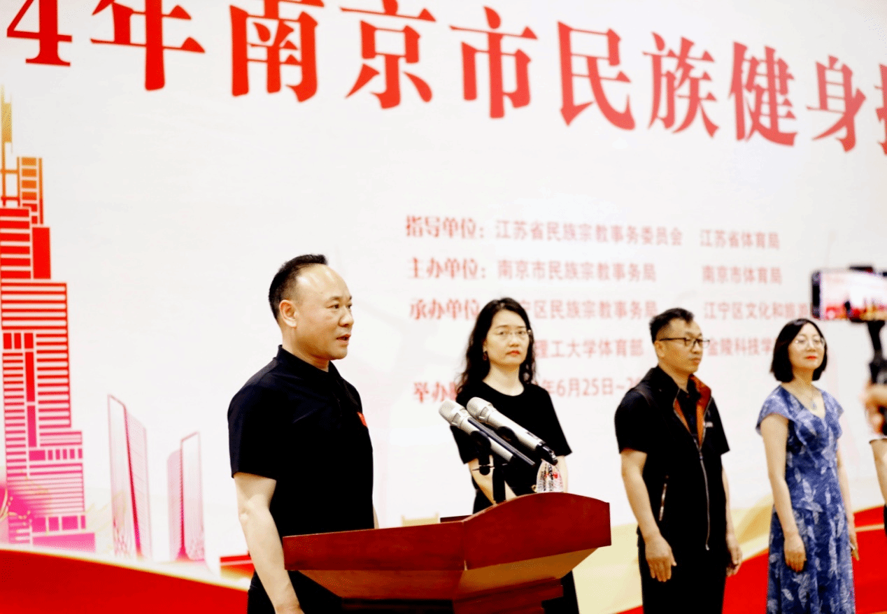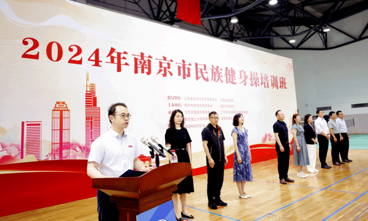 6月25日上午,由江苏省民宗委、省体育局指导,南京市民宗局、市体育局共同主办的2024年南京市民族健身操培训班在球王会体育馆开班。校党委副书记单晓峰致欢迎辞,南京市民宗局党组成员、副局长张颖华讲话,江苏省民宗委民族一处副处长黎伟平宣布开班并作开班动员。开班仪式由球王会党委常委、统战部部长黄洋主持。