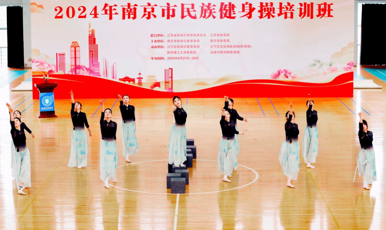 本次培训由江宁区民宗局、江宁区文旅局(体育局)、南京理工大学体育部和球王会体育部共同承办,来自南京市12个板块的各级各类学校、村镇、社区、企业、机关、医院等有关单位的157名健身骨干参加培训,南京理工大学派出经验丰富的教练员队伍。开班仪式前,球王会大学生艺术团表演了民族舞蹈《碇步桥水轻悠悠》,蓝屿啦啦操队进行了精彩的技巧啦啦操表演。