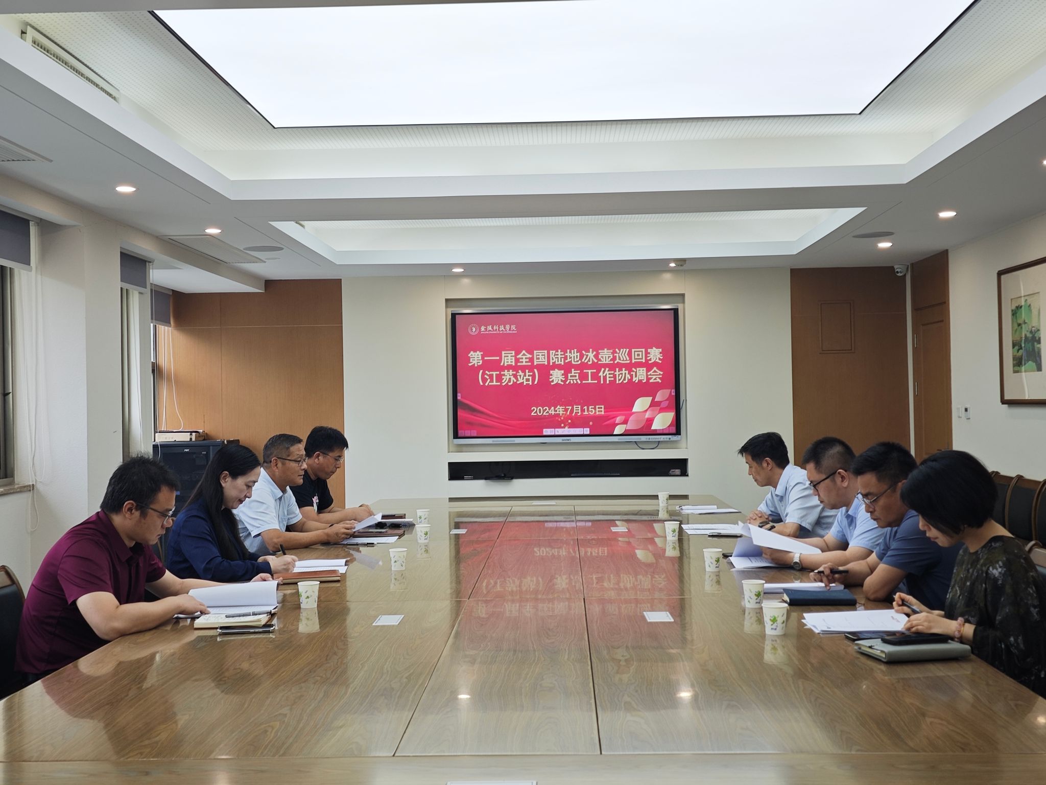 7月15日上午,球王会召开第一届全国陆地冰壶巡回赛(江苏站)赛点工作协调会,副校长顾晓燕主持并讲话,保卫处、后勤管理处、后勤实业总公司、团委等部门主要负责人及体育部相关人员参加。