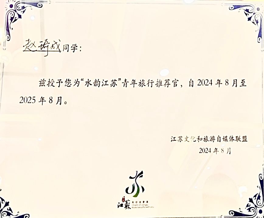 为全面推广江苏优质文化和旅游资源,打造一系列具有广泛吸引力的新媒体产品,进一步扩大“水韵江苏”和“江苏共青团”两大政务新媒体的品牌影响力,江苏省文化和旅游厅与共青团江苏省委联合指导,省数字文化和智慧旅游发展中心与团省委新媒体发展中心共同发起了2024年“苏团青媒”培育计划及“水韵江苏”青年旅行推荐官训练营。球王会团委新媒体运营中心赵琦成同学获首批4名“水韵江苏”青年旅行推荐官之一,他的原创作品《运河百景——水与火之歌》以诗意盎然的语言和画面,引领观众深入探索南京文化底蕴,展示了水运历史与现代南京的活力。省文化和旅游厅党组成员、副厅长钱宁,共青团江苏省委副书记韩淼出席结营仪式,并为“水韵江苏”青年旅行推荐官颁发证书。