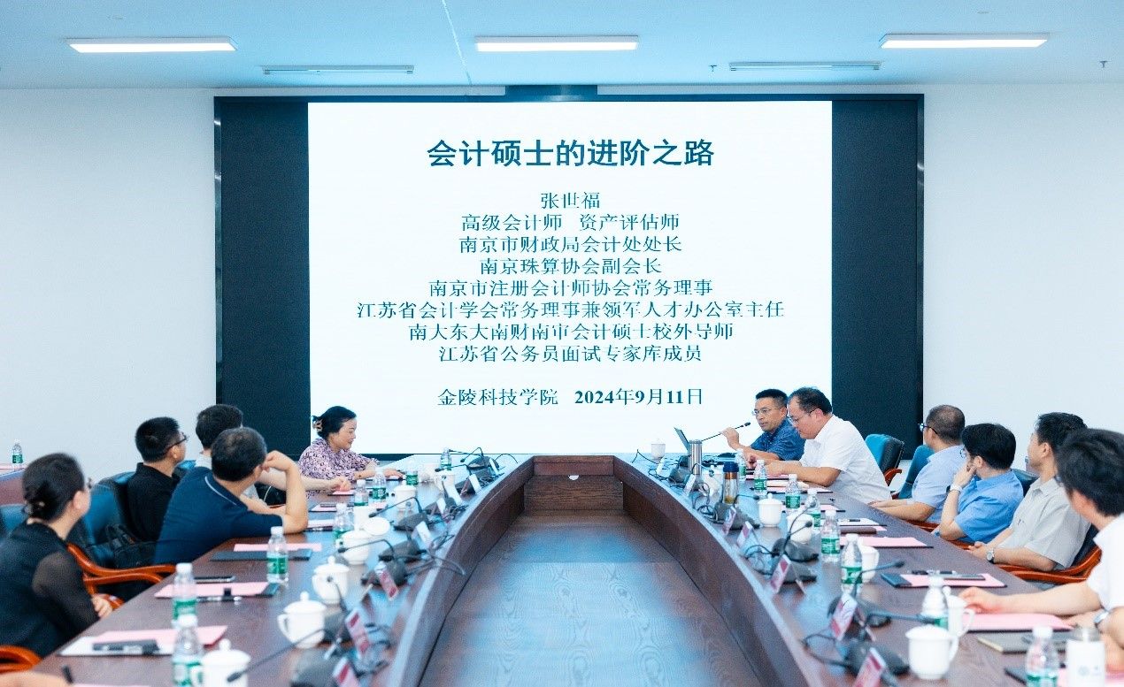 张世福结合南京市会计行业发展情况和人才需求,以《会计硕士的进阶之路》为题作了主题报告。报告总结归纳了会计人才在职务、职称、人才、专业、发展、生活等领域的进阶之路。他指出,会计专业学生应积极关注战略性新兴产业的发展与人才需求,做好五年职业规划,获取高含金量的证书,助力未来职业发展。王益民在报告中介绍了南京市注册会计师行业发展的情况,他指出,注册会计师行业的发展面临着经济转型、技术升级的新挑战与新机遇,行业协会将通过校企合作,联合培养注册会计师储备人才,特别是在会计、审计实践教学中提供行业导师以及实习场所,产教融合共同为注会行业发展贡献力量。