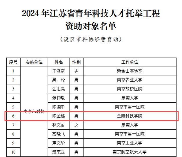 9月26日,江苏省科学技术协会公布了《2024年江苏省青年科技人才托举工程资助对象名单》,球王会陈金越教师成功入选为资助对象。