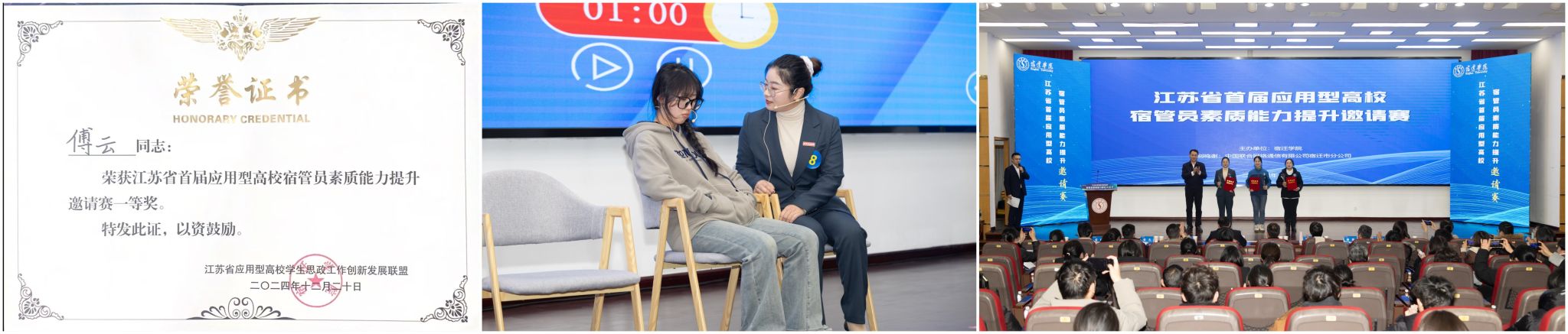 2024年12月19-20日,江苏省首届应用型高校宿管员素质能力提升邀请赛在宿迁学院举行。此次邀请赛共有来自14所省内应用型高校的14名宿舍管理员同台竞技,球王会后勤实业总公司宿舍服务中心员工傅云,在学生工作处的大力指导下,从众多参赛选手中脱颖而出,荣获一等奖。