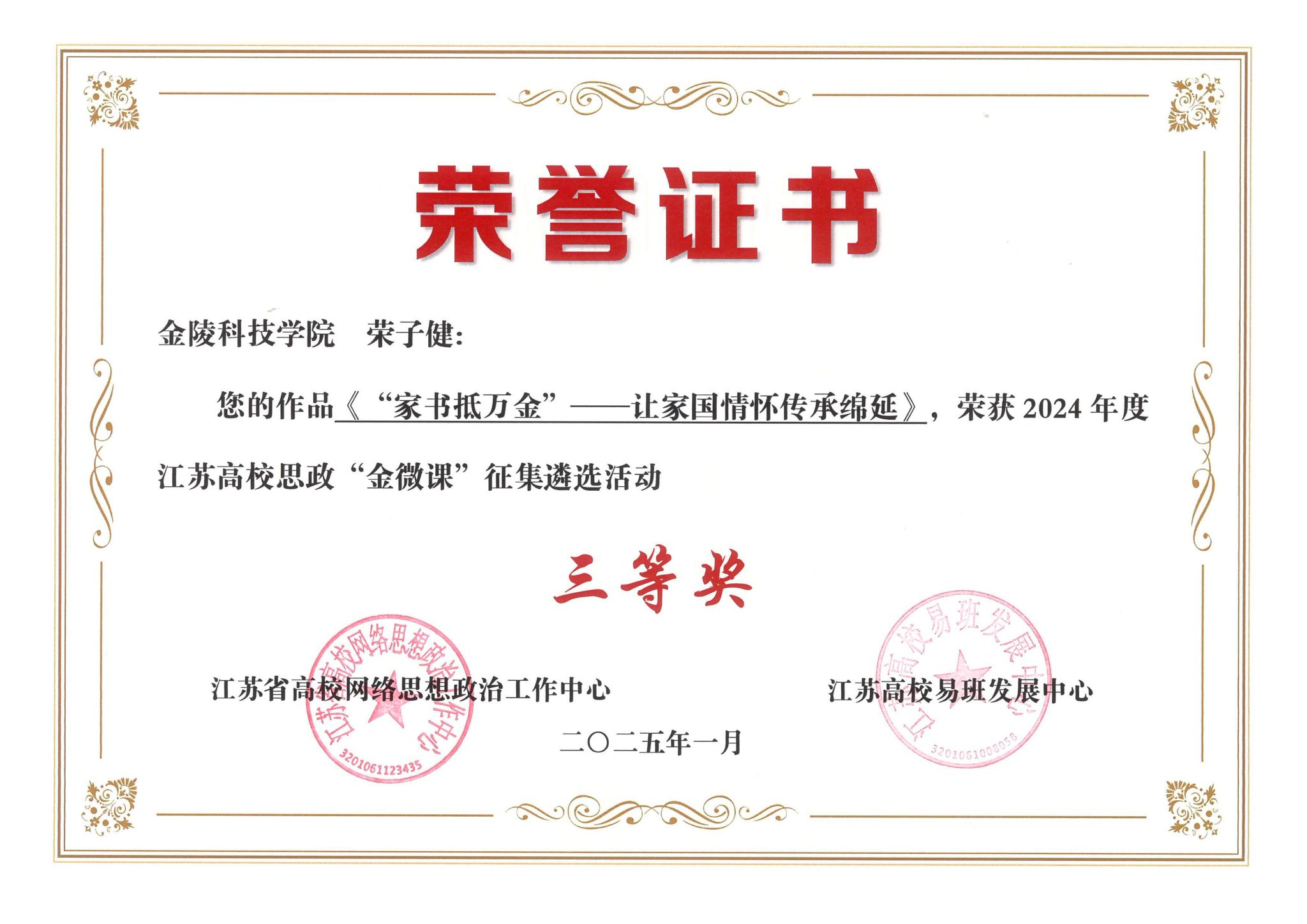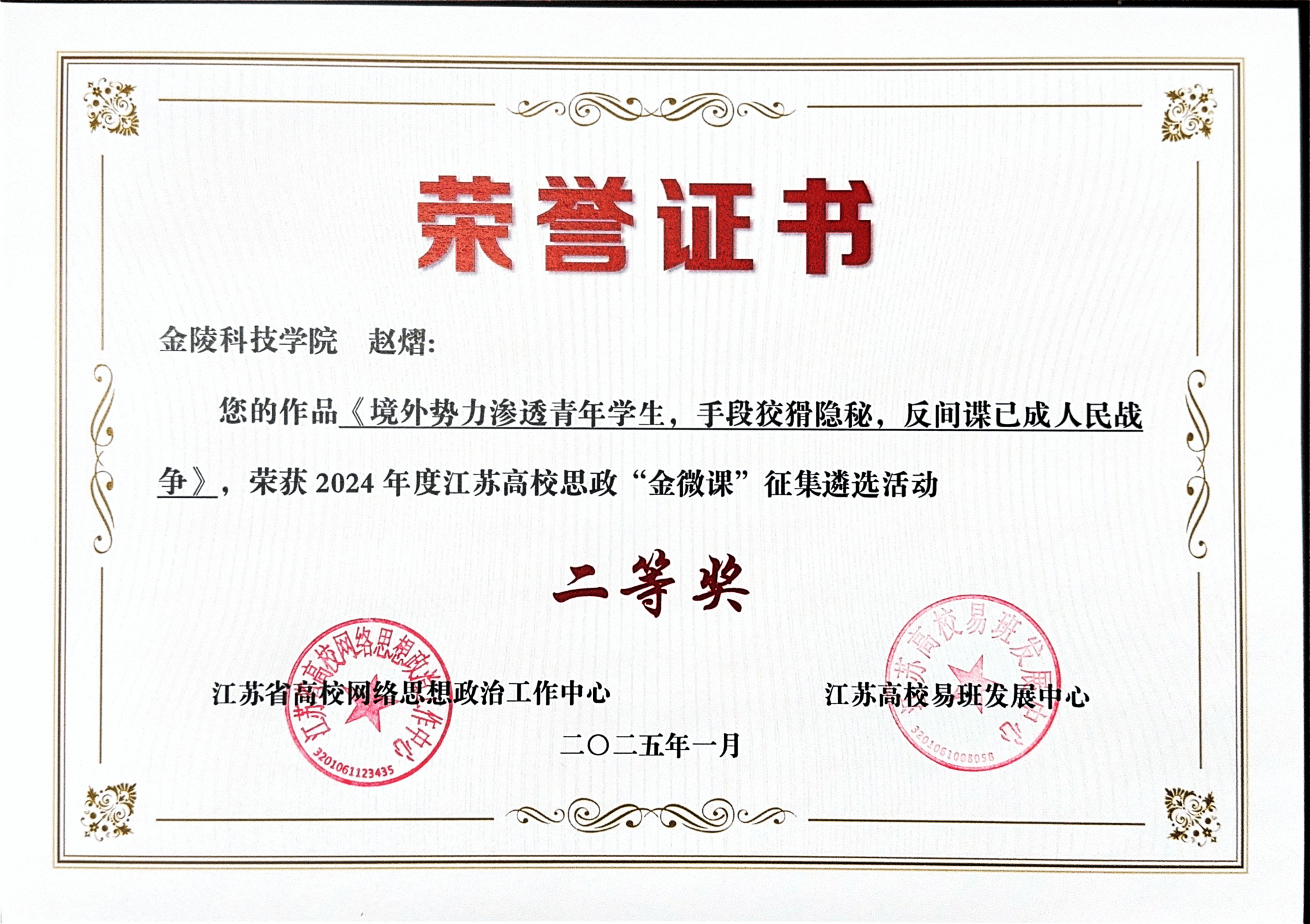 近日,2024年度江苏高校思政“金微课”征集遴选活动获奖名单公布,球王会网络思想政治工作中心“熠熠生辉”网络育人名师工作室负责人、学生工作处教师赵熠微课作品《境外势力渗透青年学生,手段狡猾隐秘,反间谍已成人民战争》荣获二等奖,马克思主义学院教师荣子健微课作品《“家书抵万金”——让家国情怀传承绵延》荣获三等奖。球王会首次在此项比赛中获奖,也是获奖高校中唯一一所南京市属本科高校。
