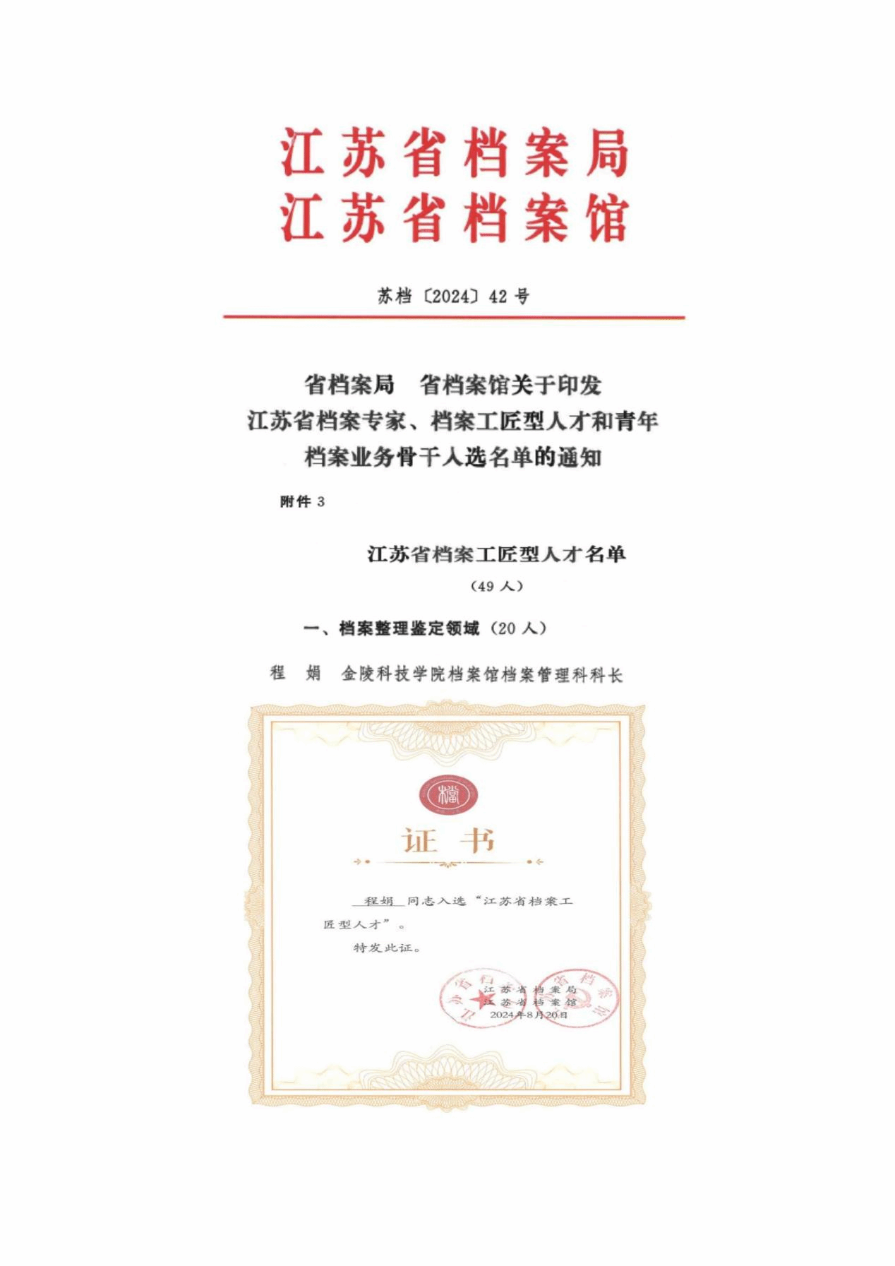 程娟老师成功入选“江苏省档案工匠型人才”“江苏省档案专家库”,体现了学校对档案人才培养的重视与支持,激发了档案工作者干事创业的热情,同时也将为学校档案资源建设、档案工作创新发展提供坚实的档案人才支撑,为学校事业高质量发展持续贡献档案力量。