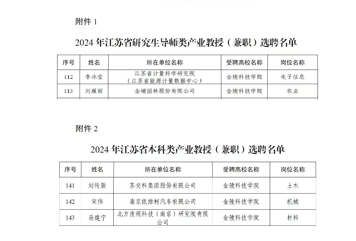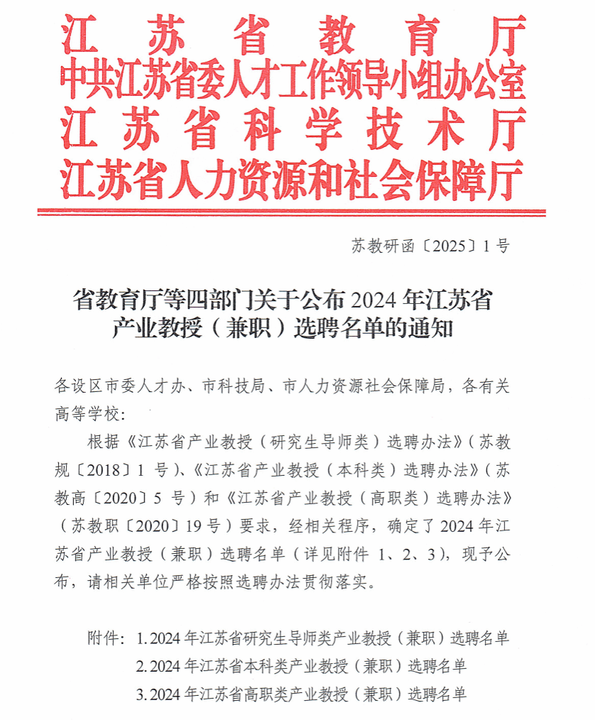 根据《江苏省产业教授(研究生导师类)选聘办法》(苏教规〔2018〕1号)、《江苏省产业教授(本科类)选聘办法》(苏教高〔2020〕5号),球王会推荐的李冰莹、刘雁丽获评2024年江苏省研究生导师类产业教授,刘传新、宋伟、孙建宁获评2024年江苏省本科类产业教授。
