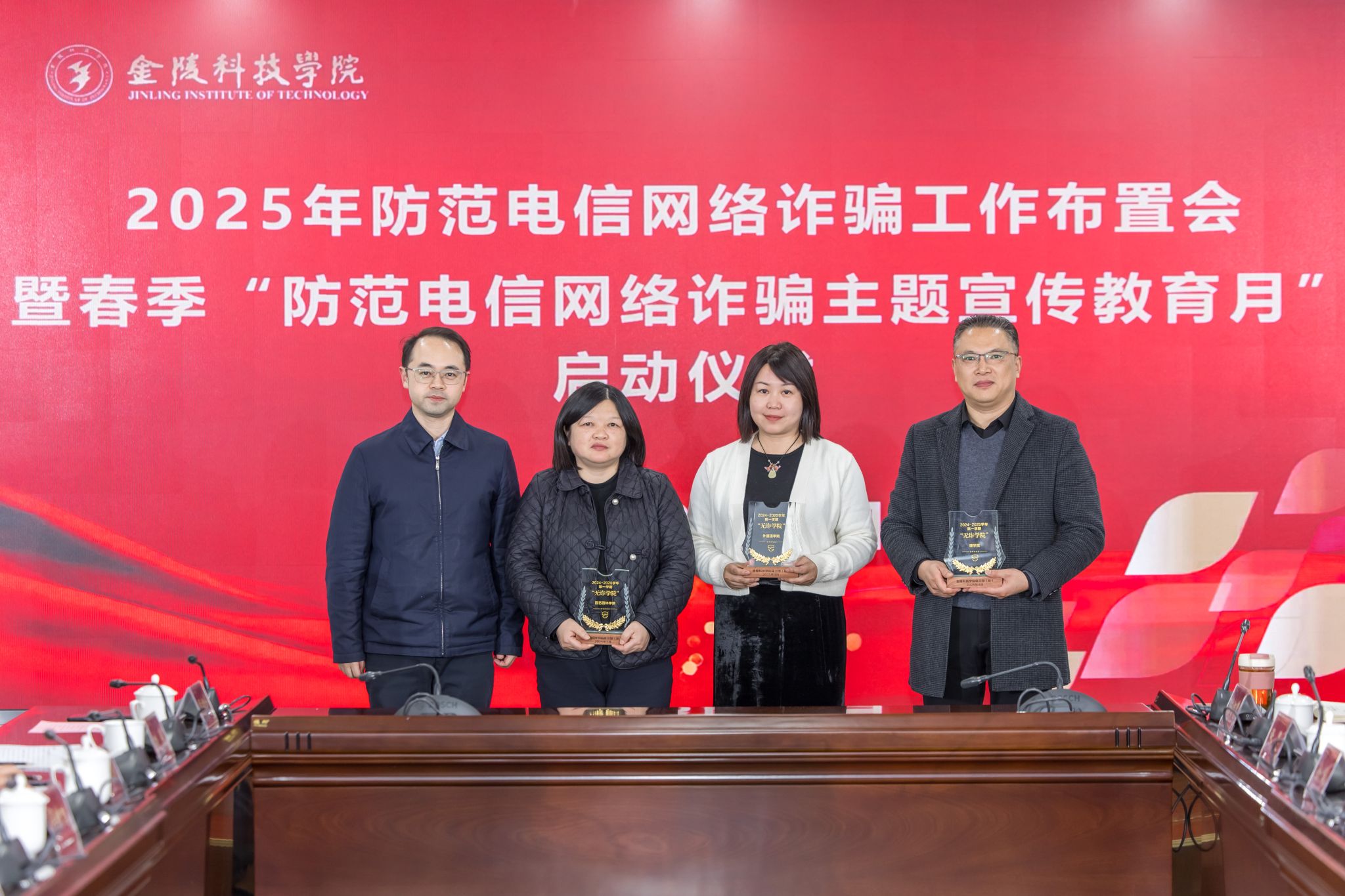 会议传达学习了习近平总书记关于安全工作的重要指示精神,向园艺园林学院、外国语学院、理学院颁发了2024-2025学年第一学期“无诈学院”奖牌。保卫处布置了球王会2025年防范电信网络诈骗工作以及主题宣传教育月活动。