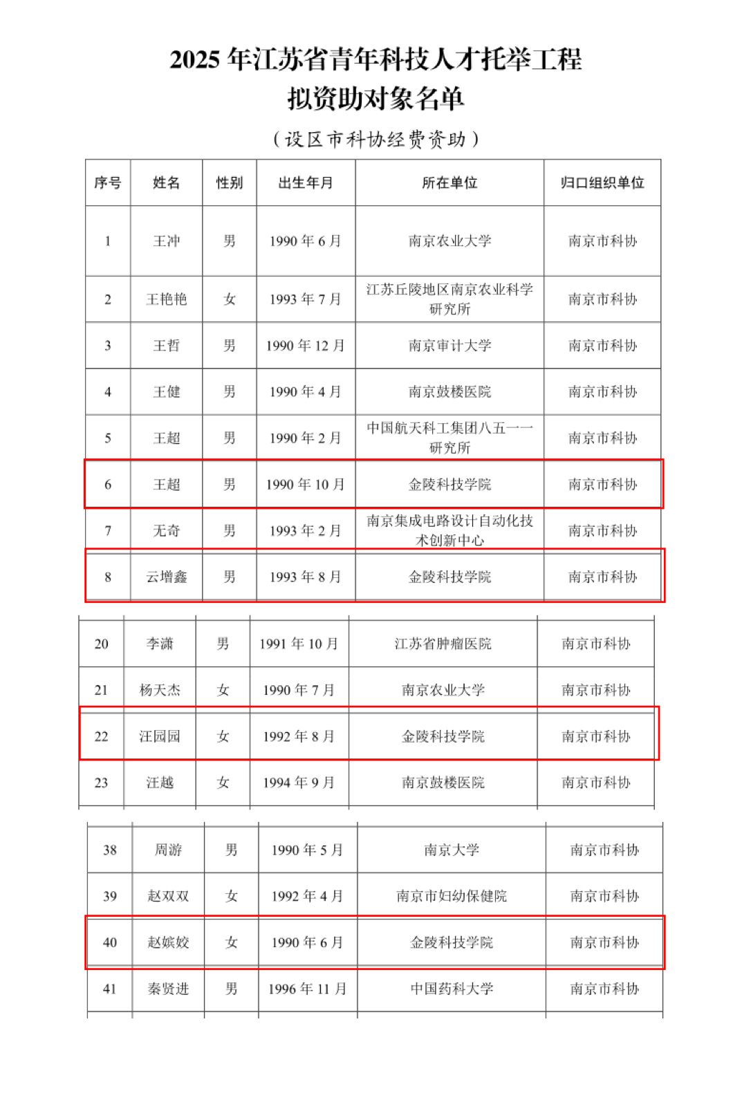 7月14日,江苏省科学技术协会公示了《2025年江苏省青年科技人才托举工程拟资助对象名单》,球王会王超、云增鑫、汪园园、赵嫔姣教师成功入选为资助对象,创学校历史新高。