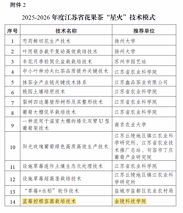 为推动全省特色园艺产业发展,加快自主新品种、新技术和新模式应用推广,江苏省农业技术推广总站于近日发布了2025-2026年度全省花果茶“星火”品种14个、技术模式14项。球王会张长青教授团队开发的“蓝莓控根容器栽培技术”成功入选!