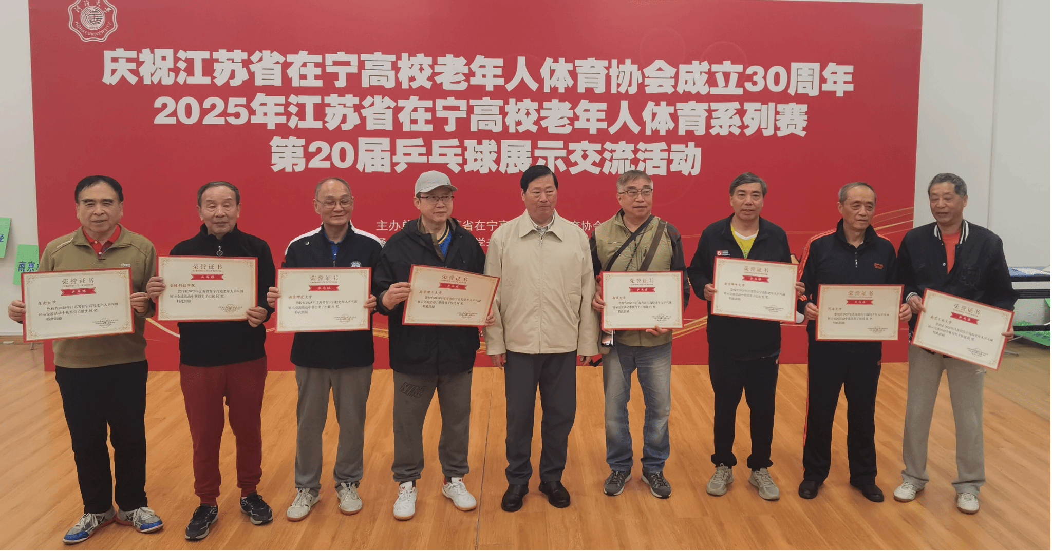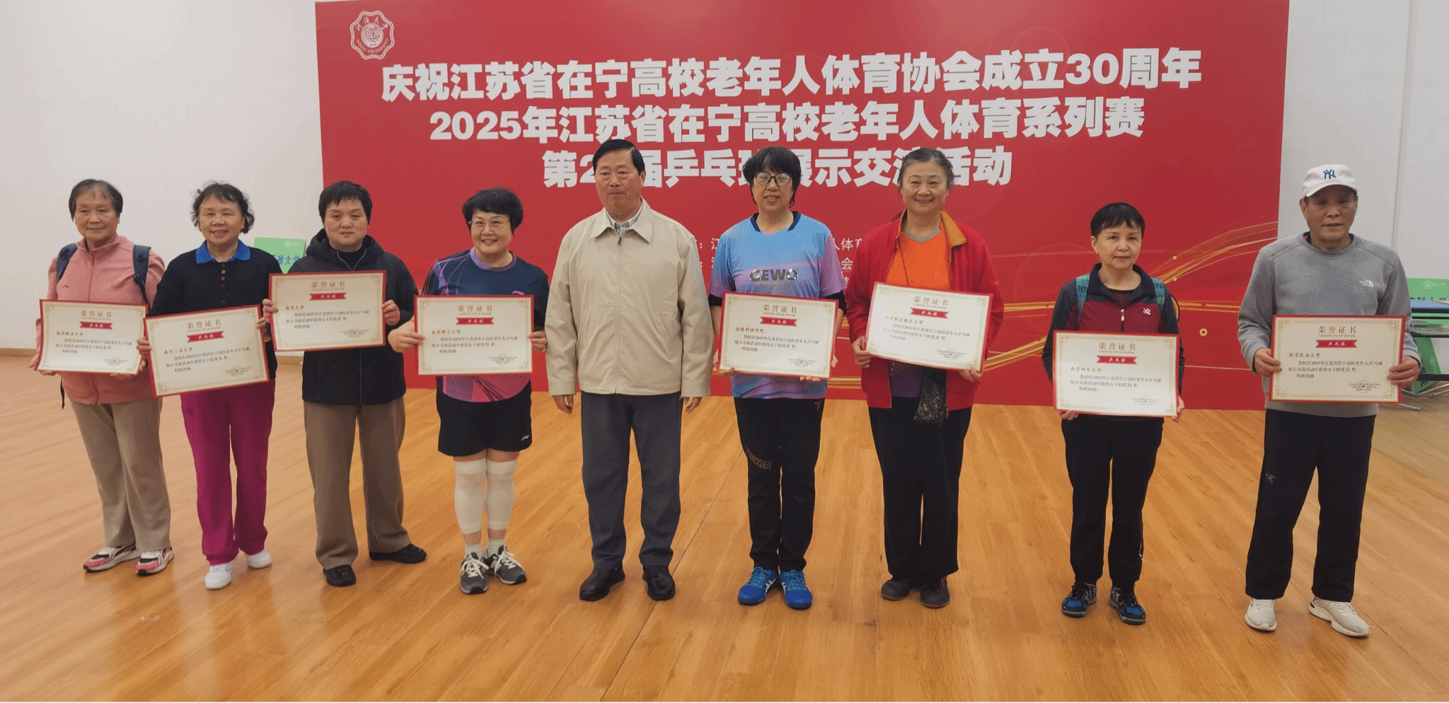11月8日,2025年在宁高校第二十届老年人乒乓球展示交流活动在河海大学举行,22所在宁高校的老年人乒乓球队齐聚一堂,以球会友。经过前期比赛选拔、认真训练,现场协同配合、顽强拼搏,球王会退教协带领老同志乒乓球队荣获女子团体亚军、男子团体第八名的好成绩。