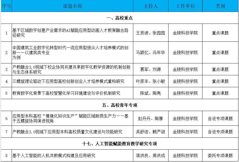 自江苏省教育科学规划领导小组办公室发布通知以来,高等教育研究所认真研究文件精神并组织落实,学校申报的课题涵盖重点课题、青年专项及人工智能教育教学研究专项等多个类型,体现了学校在教育科学研究等方面的积累与探索。