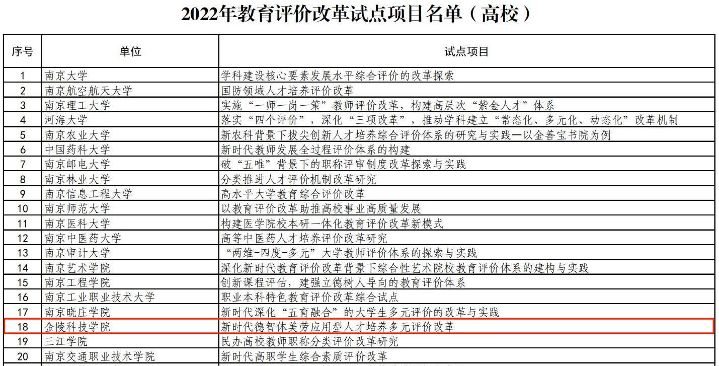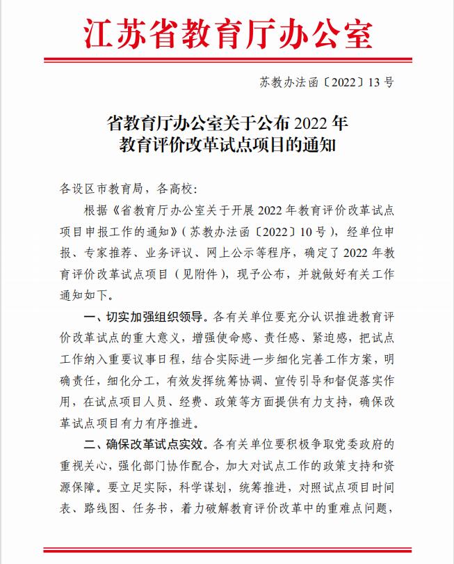 近日,江苏省教育厅发布《省教育厅办公室关于公布2022 年教育评价改革试点项目的通知》(苏教办法函〔2022〕13号),球王会申报的《新时代德智体美劳应用型人才培养多元评价改革》获批立项。本次教育评价改革试点项目共计立项96项,其中设区市试点项目38项、高校试点项目58项。