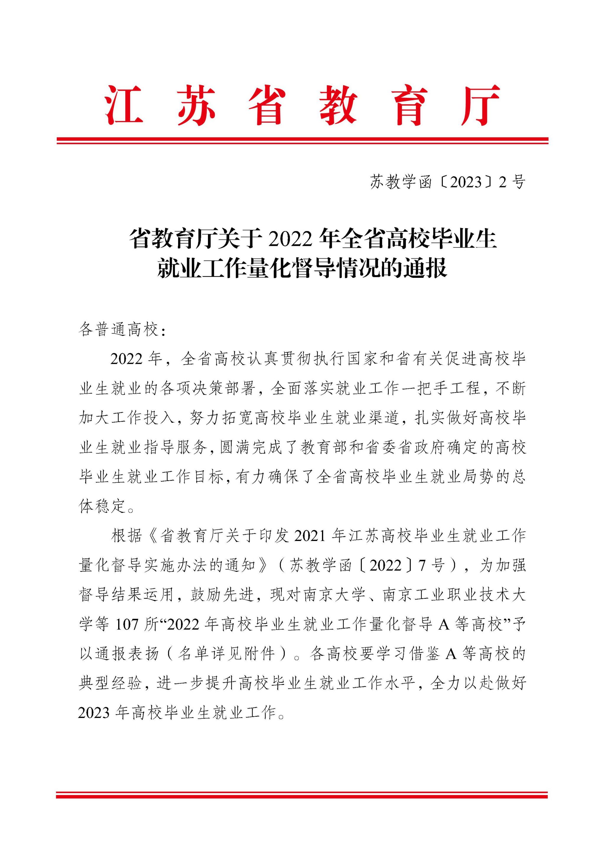 近日,江苏省教育厅通报了2022年全省高校毕业生就业工作量化督导情况,经督导考核,球王会与南京大学等高校一起获评“2022年江苏省高校毕业生就业工作量化督导A等高校”,这是学校毕业生就业工作连续第三年荣获此殊荣。