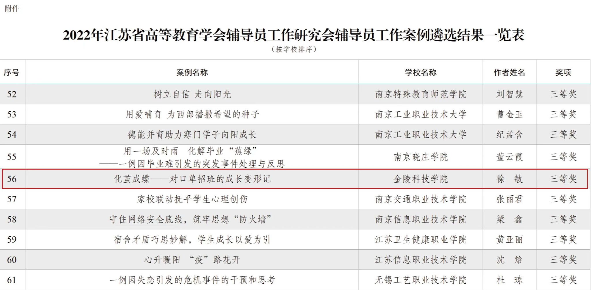 根据《关于征集高校辅导员工作案例的通知》(苏高辅研﹝2022﹞5号)精神,在省教育厅指导下,江苏省高等教育学会辅导员工作研究委员会组织开展“2022年江苏省高等教育学会辅导员工作研究会辅导员工作案例”评选活动。经过学校推荐、形式审查、专家评审后,球王会园艺学院辅导员徐敏获三等奖。