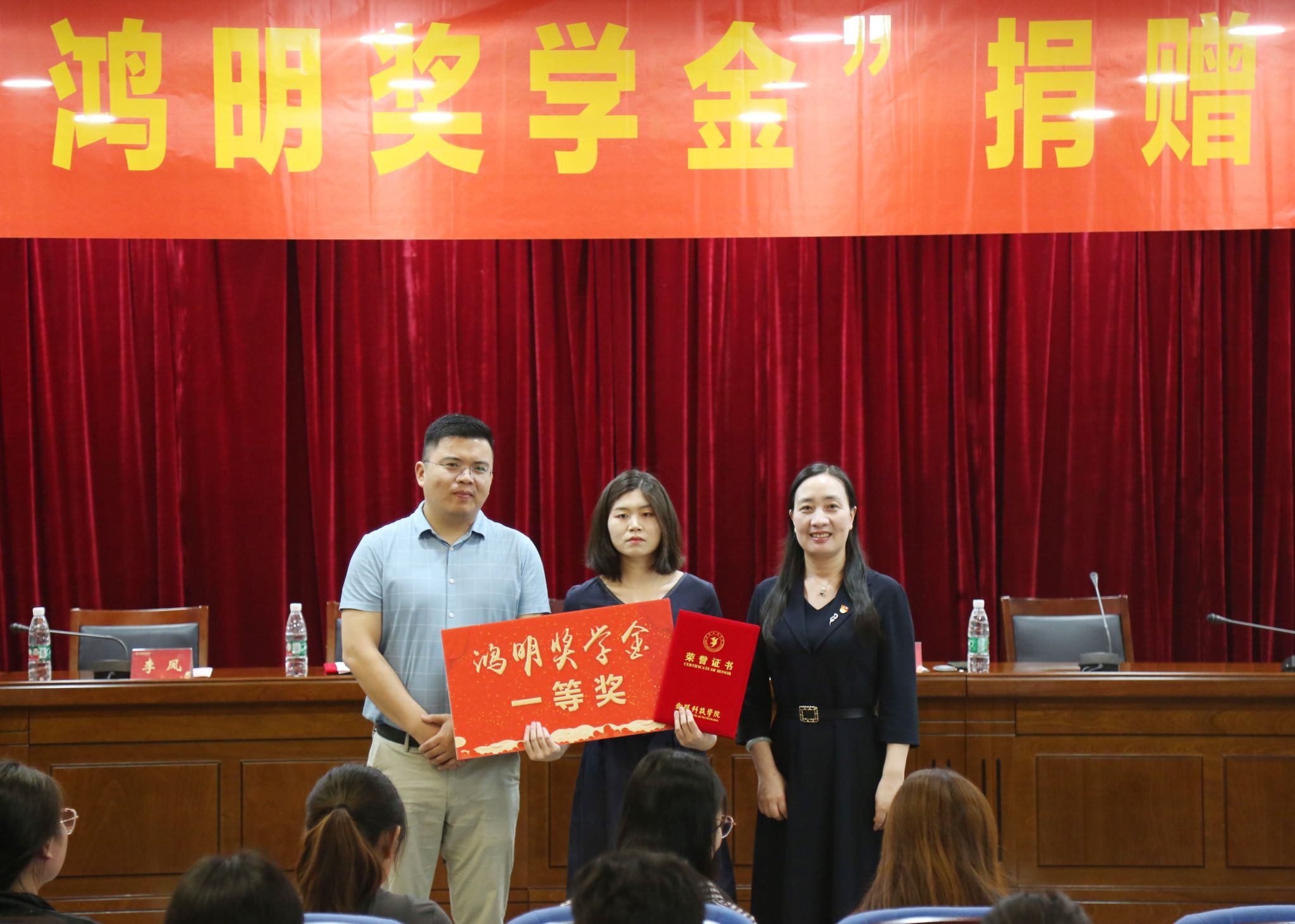 顾晓燕代表学校接受了“鸿明奖学金”捐赠,并授予邢鸿明捐赠证书。顾晓燕、邢鸿明和外国语学院党总支部书记李星、副院长李凤分别为外国语学院实现高质量就业的2023届毕业生颁发了“鸿明奖学金”。