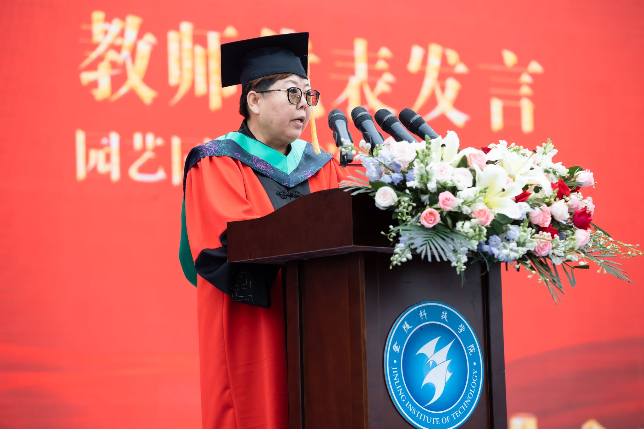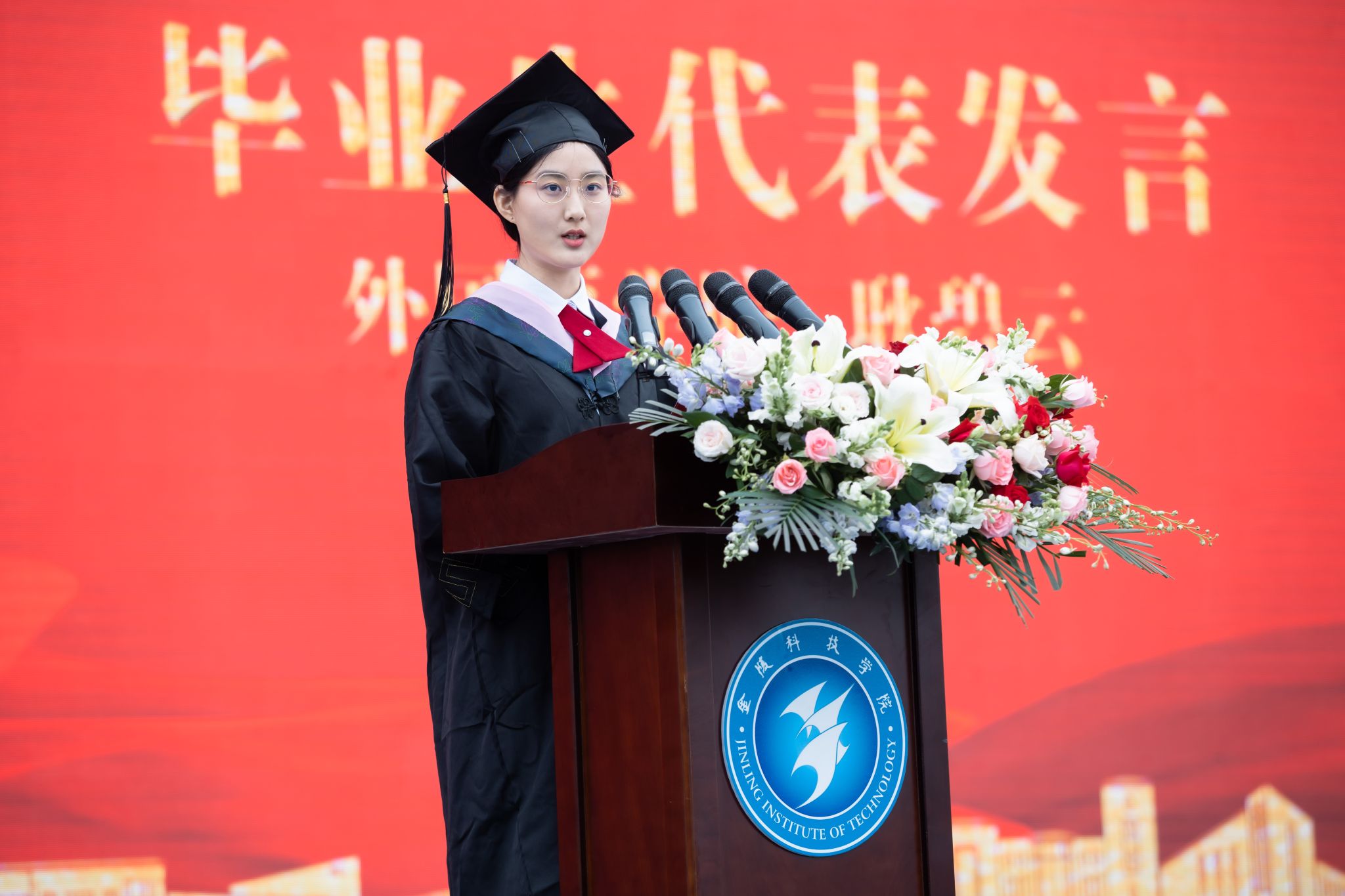 典礼现场播放了《怀念青春》毕业纪念视频,毕业生代表为教职员工代表献花表达感激之情。教师代表、园艺园林学院马艳教授在发言中希望毕业生们踏入社会后要保持奋斗精神、保持好奇心、志存高远。毕业生代表、外国语学院耿碧云同学在发言中分享了在学校四年的成长收获,表达了对母校的依依不舍之情。