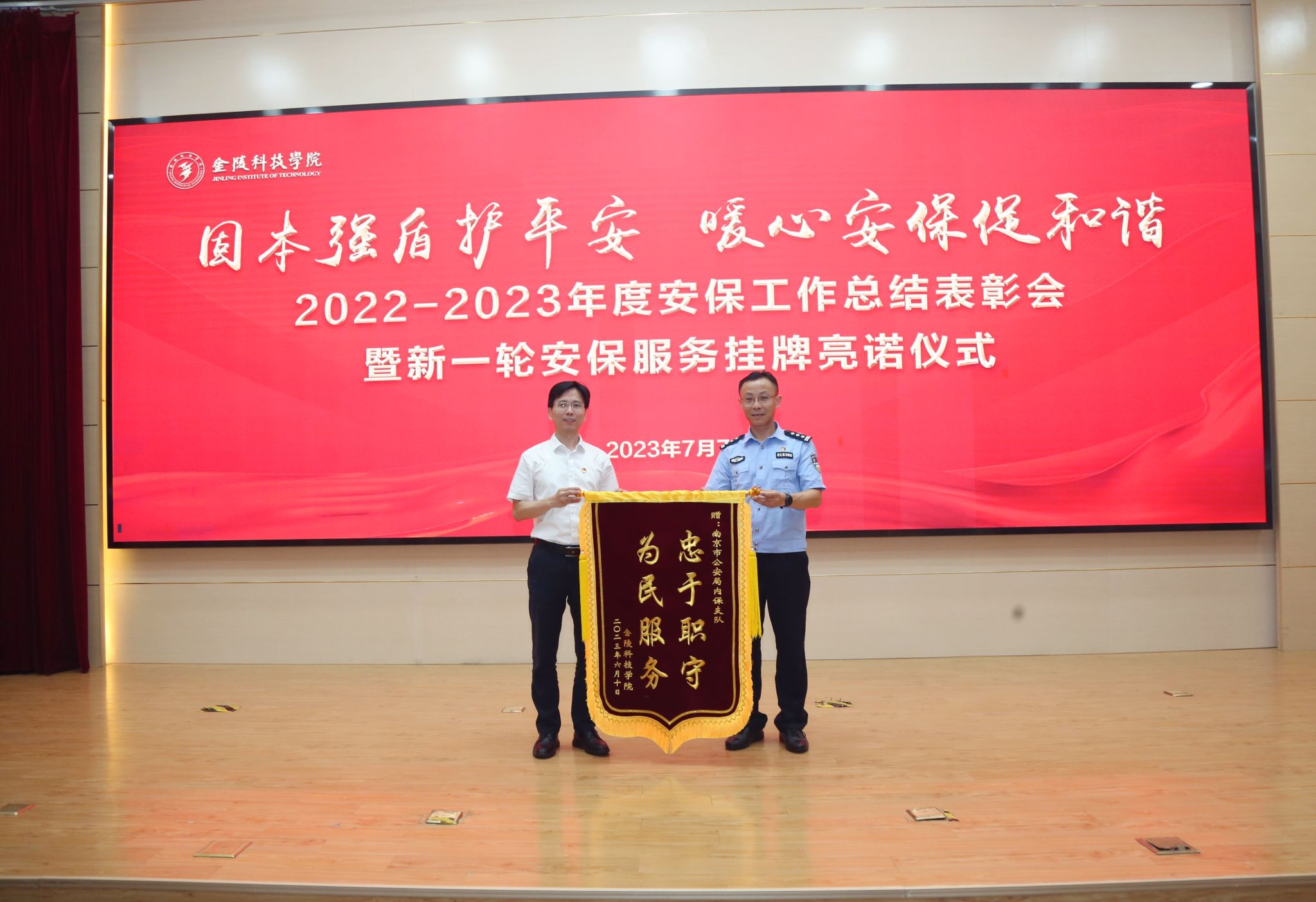 7月7日下午,球王会在江宁校区科技楼报告厅举行2022-2023年度安保工作总结表彰会暨新一轮安保服务挂牌亮诺仪式。南京市公安局内保支队副支队长卢才勇、江宁分局副局长季海、内保支队特侦大队副大队长刘峰,高新区派出所所长马小虎、教导员俞亮应邀参会,副校长叶智锐出席并讲话。会议由保卫处处长骆德军主持。