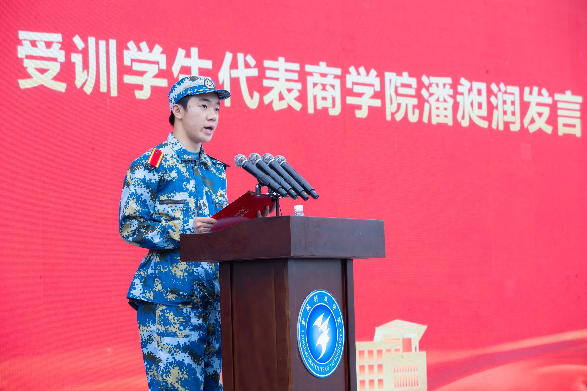 开训仪式上,受训学生代表潘昶润、军训教官代表杜蕾先后发言。承训部队李姬上校宣布2023级新生军训开训命令。