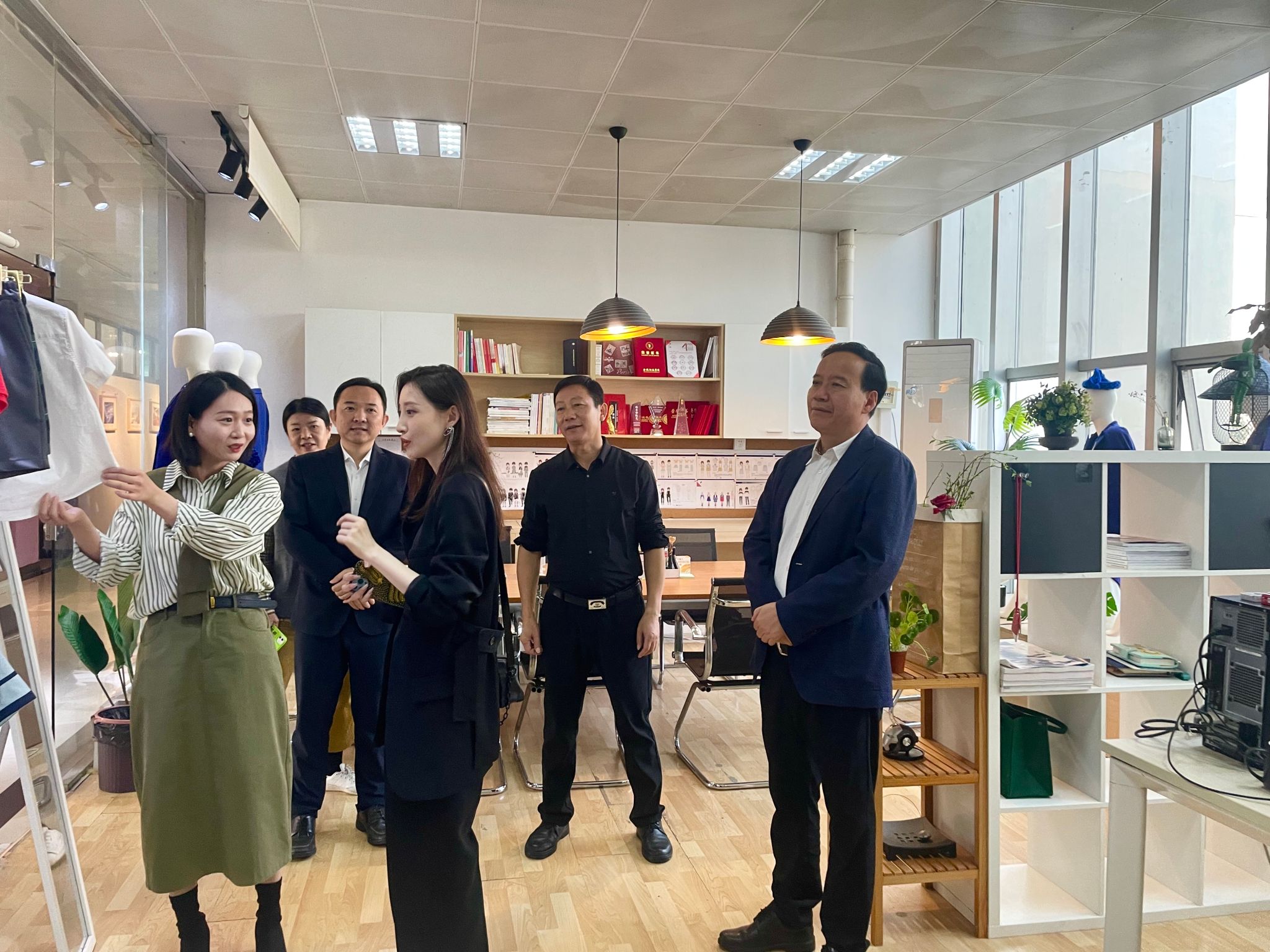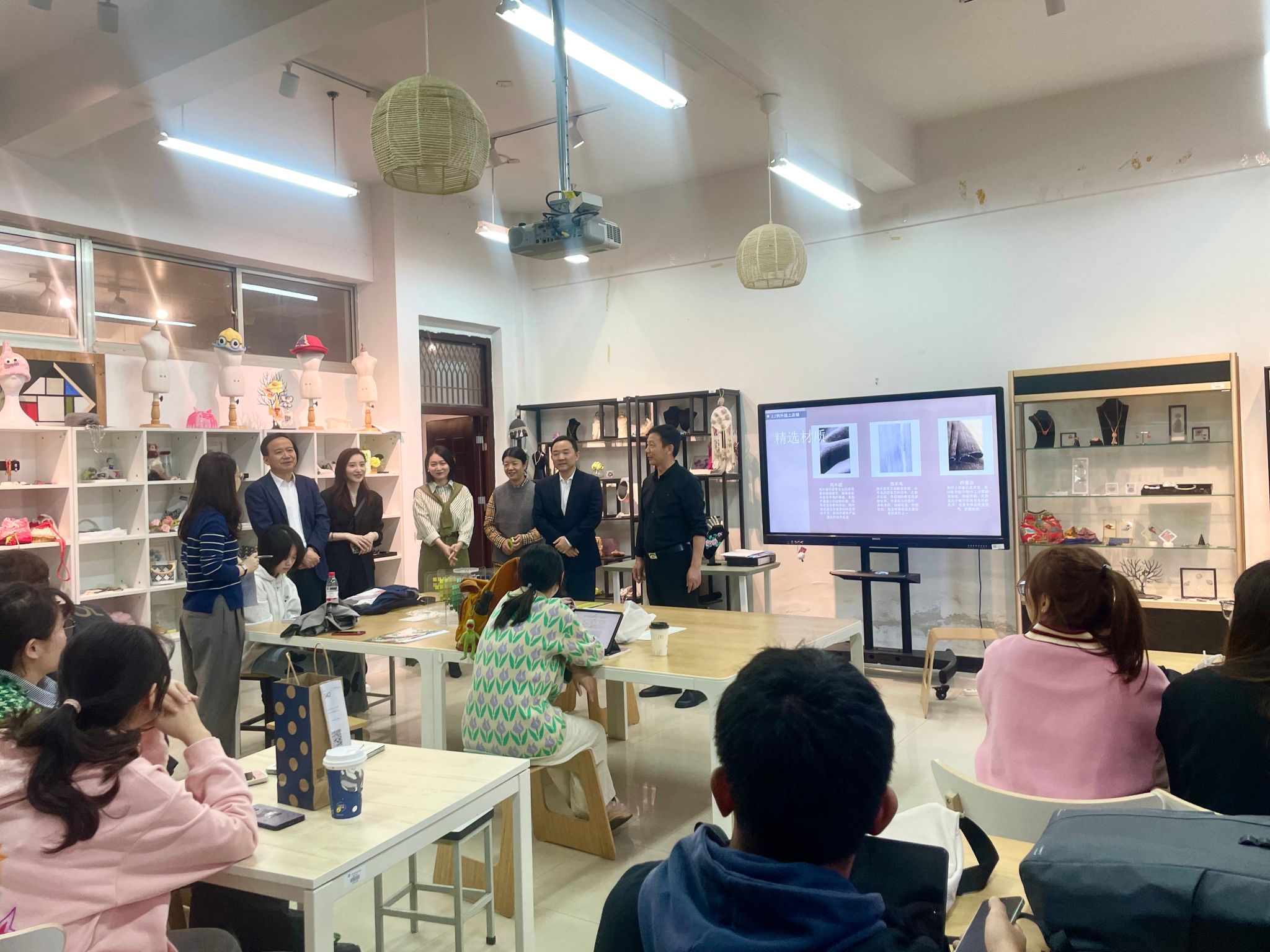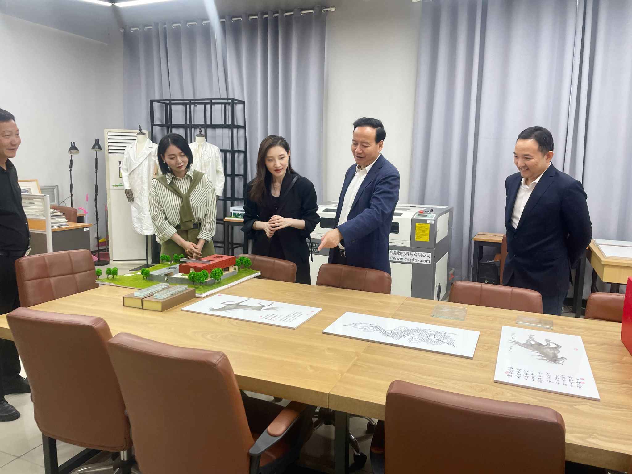 谈伊妮参观了艺术学院的江苏省劳模创新工作室、科学与艺术创意中心和服装设计系实验室。在座谈交流中,她对艺术学院的教学资源、实验室建设、人才培养和学生学科竞赛成果给予高度评价,并与学校在产学研平台建设、毕业生实习就业等方面达成合作意向。