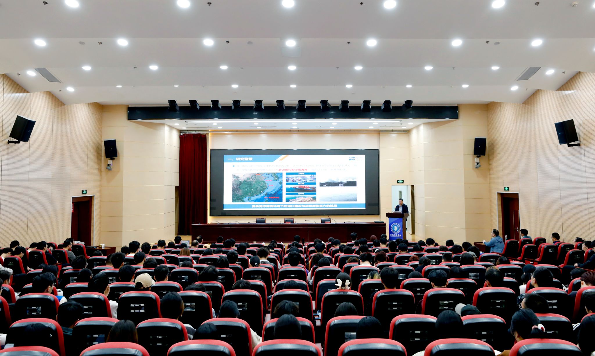 蔡正银教授以他多年来在土木水利、海港交通等领域取得的卓越成果为例,向在场师生生动阐释了“复杂海洋地质环境下沿海港工建筑物创新与实践”的主题。他的报告主要涵盖深水板桩码头的关键技术、桶式基础防波堤的关键技术、港口工程离心模拟与测试技术三个关键方面。蔡正银教授的讲解通俗易懂,让师生深切领略了在复杂海洋地质环境下港口建设所面临的挑战和解决之道。他认为,创新源于工程实践,也源于不懈努力。他鼓励师生们保持创新的心态,在不断探索中需要实现突破。