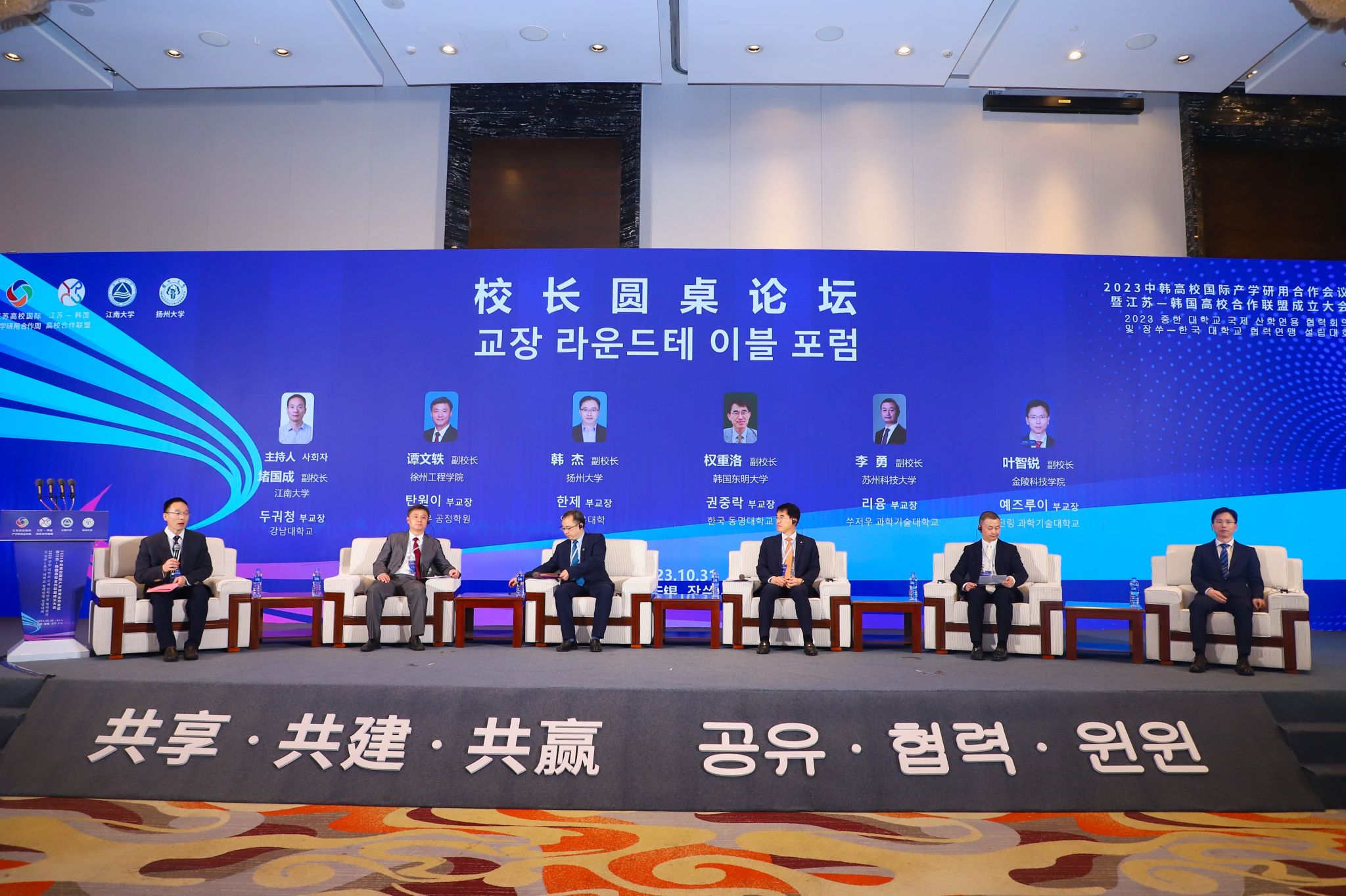 10月31日上午,由江苏省教育厅指导,江南大学、扬州大学共同主办的2023中韩高校国际产学研用合作会议暨江苏-韩国高校合作联盟成立大会在无锡召开。江苏省教育厅对外合作与交流处处长施蕴玉、大韩民国驻上海总领事馆教育领事赵洪善、大韩民国驻上海总领事馆教育首席专员全天日、无锡市人民政府外事办公室副主任咸贞玉、无锡韩国商会会长柳荣泫,联盟主席单位江南大学校长陈卫,联盟秘书处单位扬州大学副校长韩杰,以及联盟成员高校的中方、韩方校领导等出席大会。球王会副校长叶智锐受邀出席会议并在校长圆桌论坛环节作交流发言。