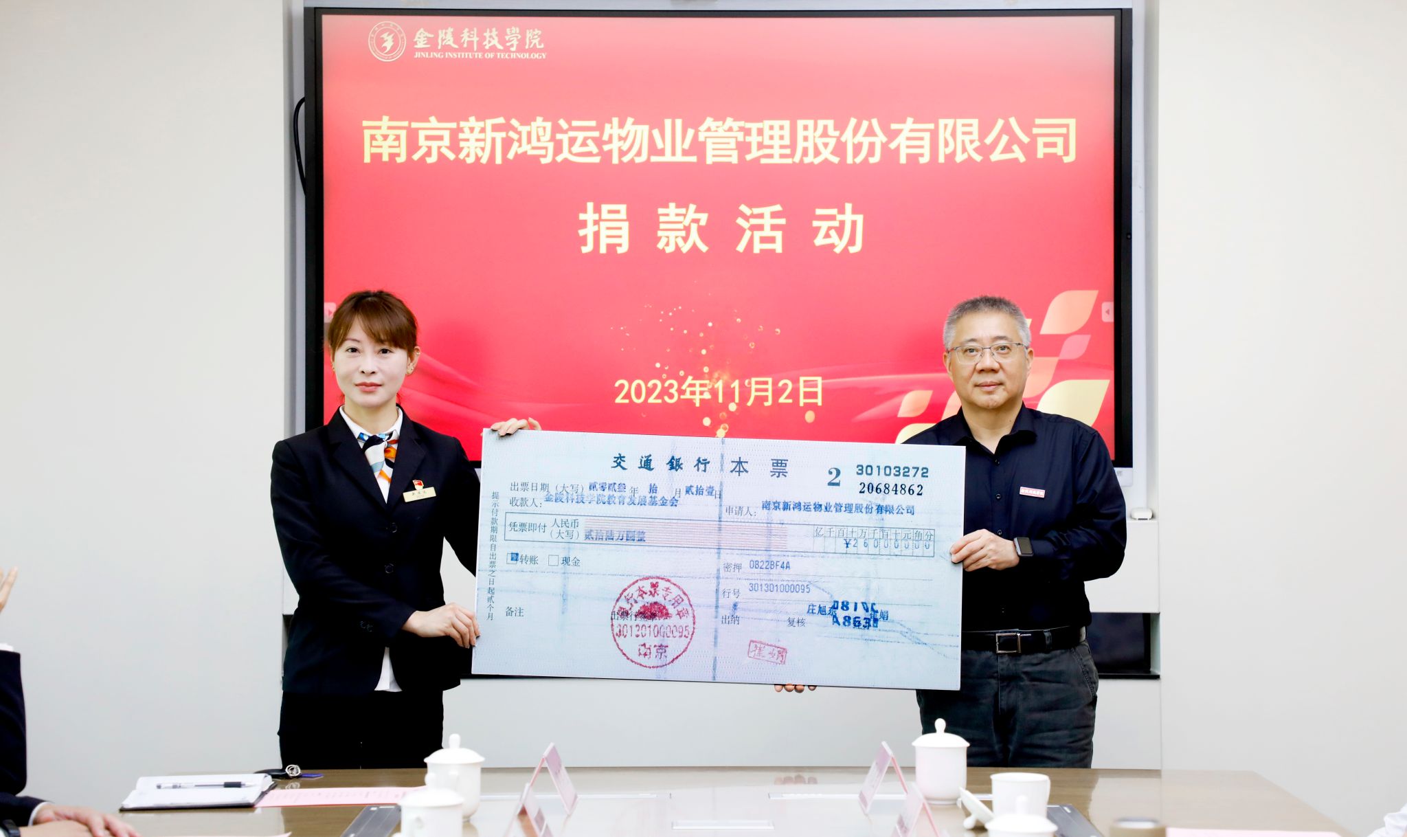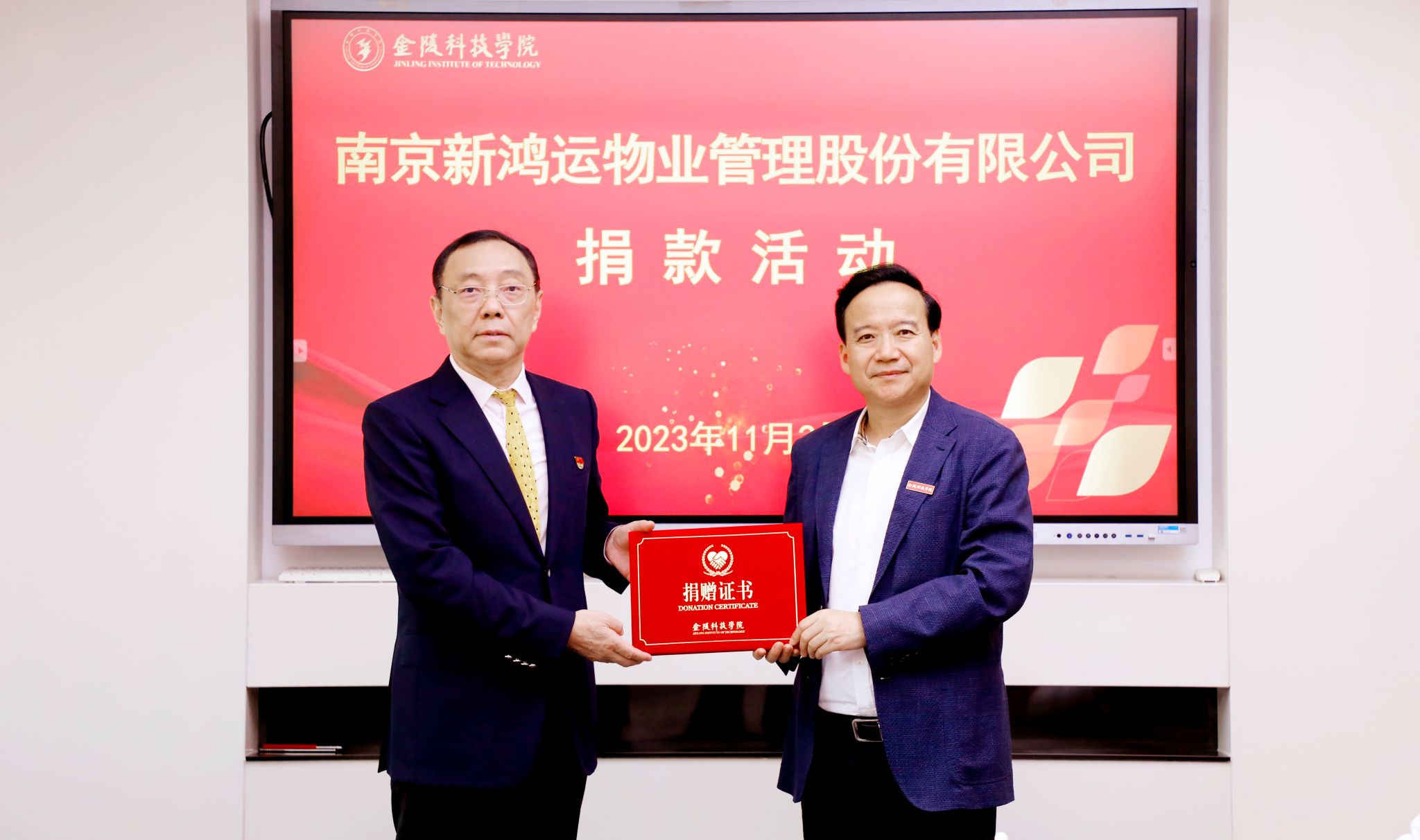 11月2日上午,南京新鸿运物业管理股份有限公司捐款活动在江宁校区行政楼319会议室举行。新鸿运公司董事长王中宁、副总经理徐敏及培训部负责人和项目经理,球王会校长刘永彪、副校长高永祥及校长办公室、学生工作处、后勤管理处、后勤实业总公司及教育发展基金会负责人参加捐款活动。活动由高永祥主持。