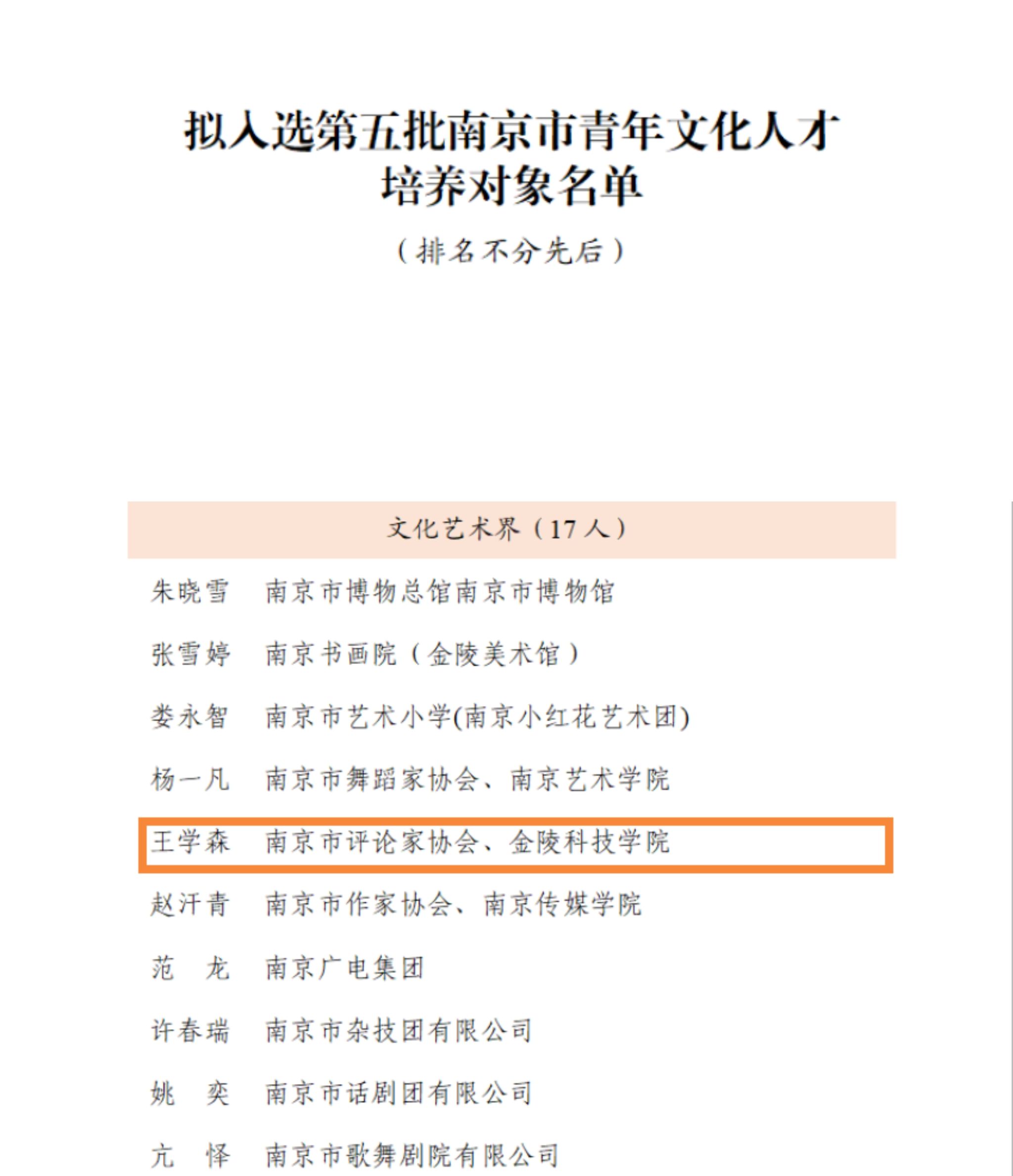 根据《关于开展南京市宣传文化系统第七批“五个一批”人才和第五批青年文化人才选拔培养工作的通知》精神,经个人申报、资格审核、单位推荐、专家评审、信息核查、市委宣传部研究等程序,球王会人文学院王学森博士被遴选为第五批南京市青年文化人才培养对象。