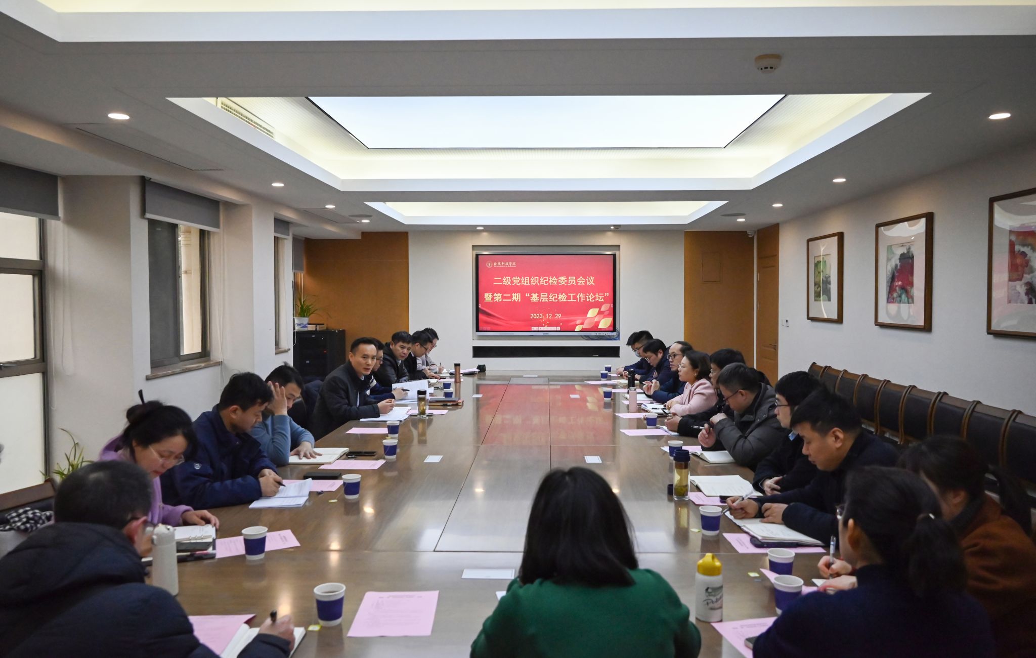 与会人员深入学习了习近平总书记在《求是》杂志发表的文章《扎实推动教育强国建设》以及在中共中央政治局会议上的重要指示批示精神,集体学习了《事业单位工作人员处分规定》。纪委办主任周骏通报了学校2023年纪检监察工作,就元旦春节期间廉洁提醒、开展好重点事项监督和近期工作作了布置。纪委办副主任陈莉莉作了《“四风”问题表现形式及政策规定》的专题报告。二级党组织纪检委员杨如丽、董宇、纪易凡三名同志围绕履职情况进行了交流发言。