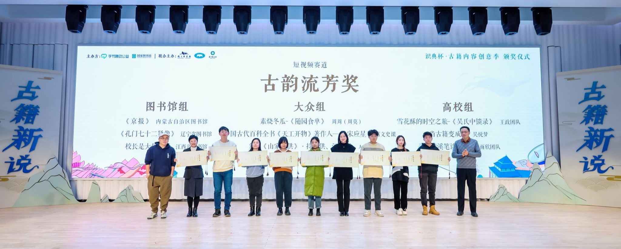 本次比赛由字节跳动公益、国家图书馆(国家古籍保护中心)主办,南京图书馆、云南省图书馆、苏州图书馆联合主办。比赛分为视频和设计两大赛道,视频赛道又分为大众组、高校组和图书馆组。从8月活动发起以来,活动组委会共收到226件参赛作品,其中视频作品182件,设计作品44件。这些作品涉及90余部古籍。视频作品来自45位创作者、47家图书馆以及16所高校的团队和个人;设计赛道的44件作品来自字节跳动员工。参赛者来自不同行业和领域,他们结合所长,让古籍内容以新的方式展现在公众面前。