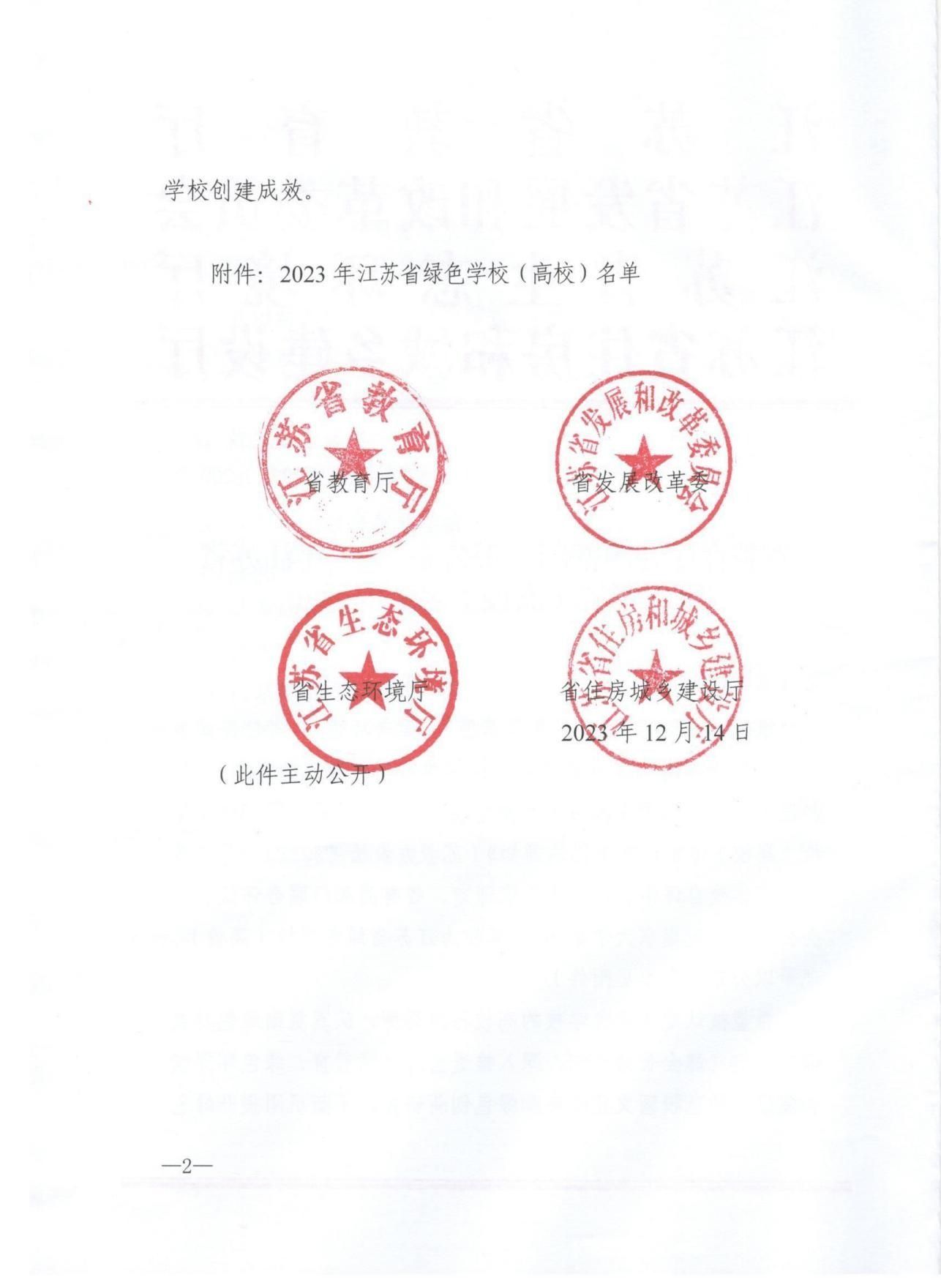近日,省教育厅、省发展改革委、省生态环境厅、省住房和城乡建设厅联合发文公布2023年江苏省绿色学校(高校)名单,球王会荣列其中。