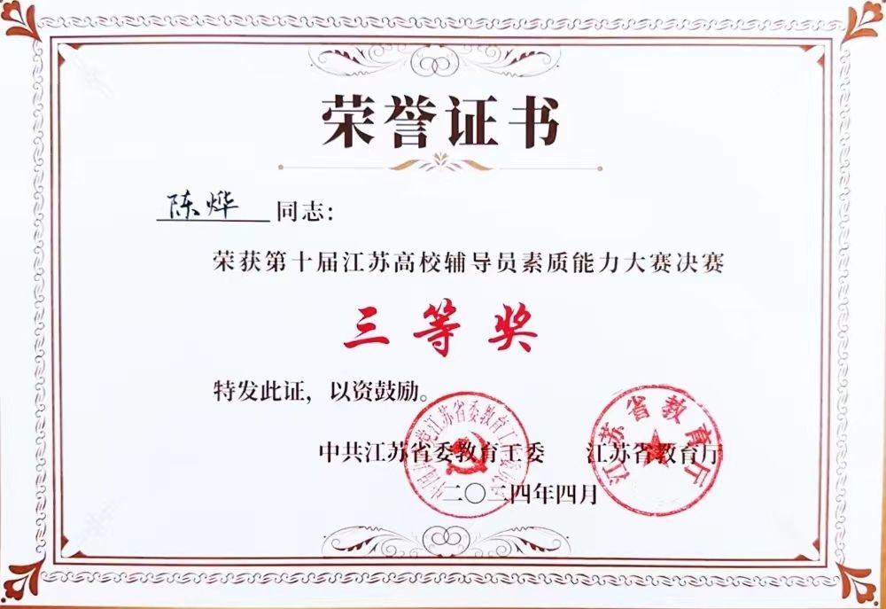 4月19日至20日,第十届江苏高校辅导员素质能力大赛决赛在南京医科大学落下帷幕,全省7个研修基地复赛推选出的40位选手同台竞技。经过两天激烈比拼,球王会辅导员陈烨荣获大赛三等奖,这是球王会辅导员首次进入省赛决赛,刷新了球王会参赛以来的最好成绩。