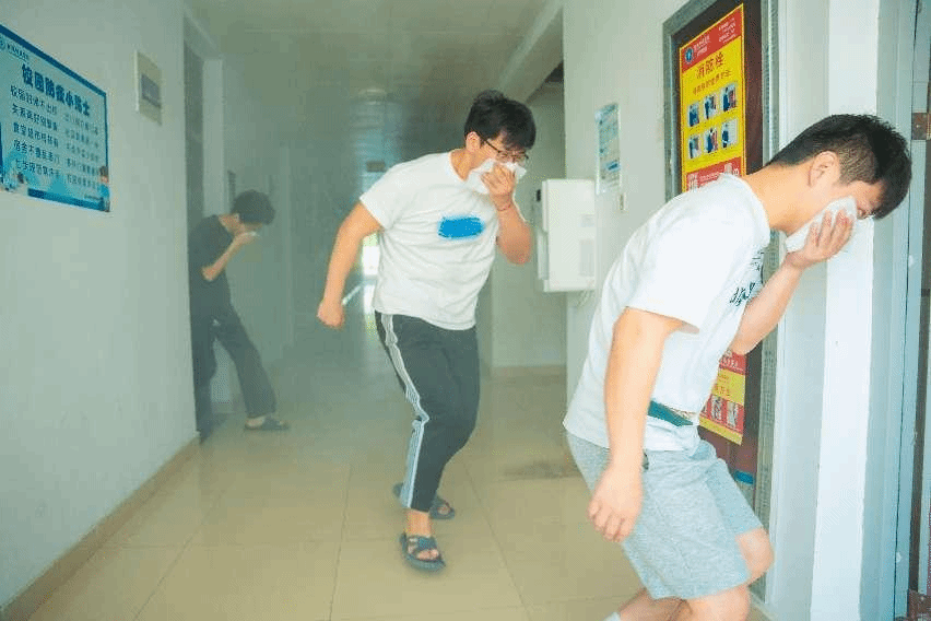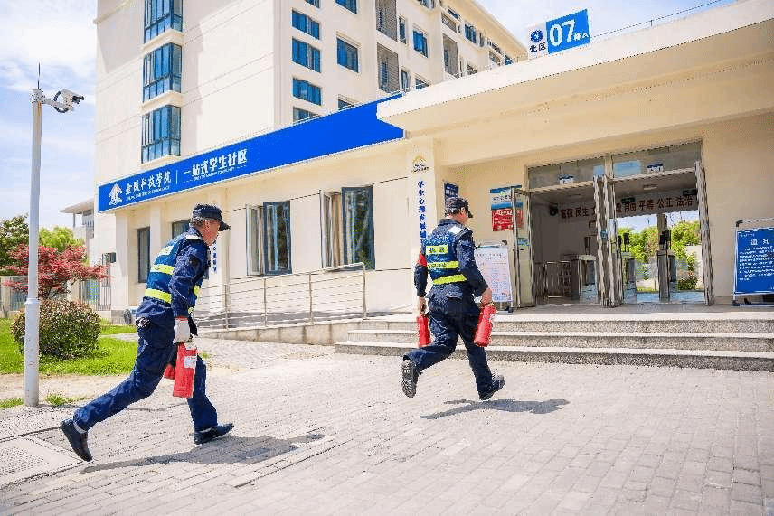 江宁校区北区7栋学生宿舍、南区10栋学生宿舍的全体学生分两批次参与演练。演练开始后,各栋宿舍管理员立即按响声光报警器,拨打“119”报火警、拨打校园119报火警;辅导员、宿管员、社区管委会成员组成的疏导组引导学生有序撤离到安全区域;义务消防队员和保安员组成的警戒组立即开展人员集中和人数清点;江宁区消防救援大队高新区站和学校微型消防站人员分别进行“失火”宿舍的灭火和被困人员救助;医疗救护组及时对“受伤学生”进行包扎救助。