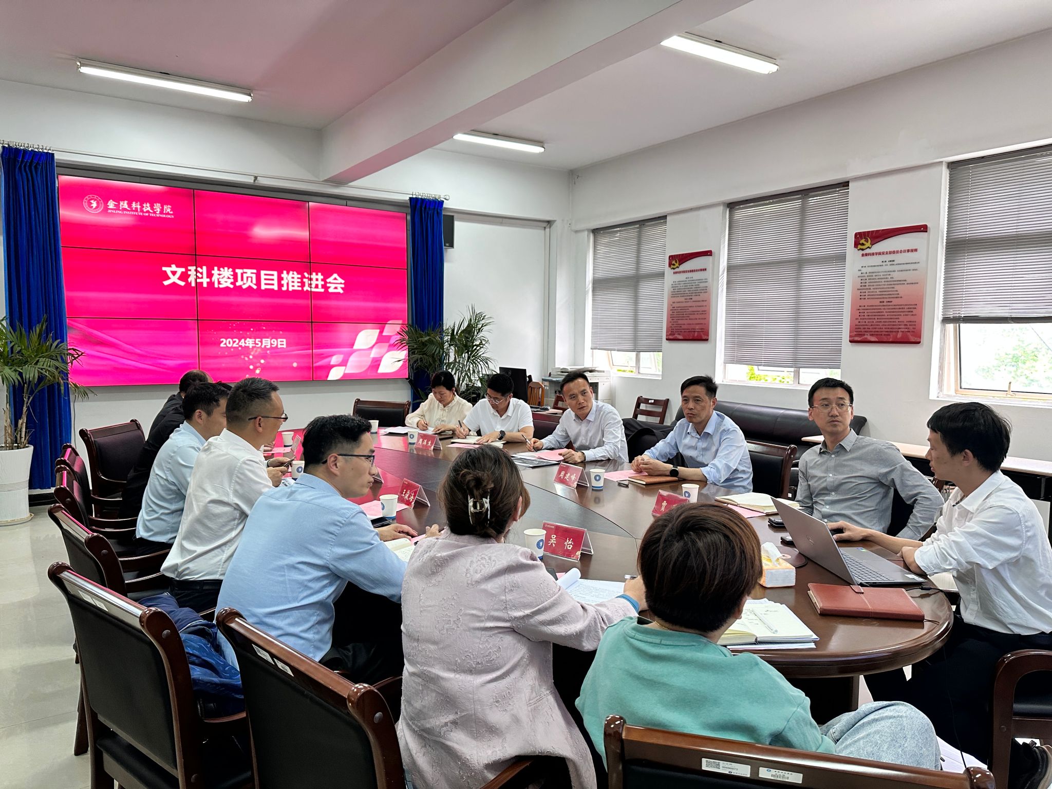 5月9日下午,副校长王延光调研文科楼项目并召开项目推进会,南京市河西新城区国有资产经营控股(集团)有限责任公司、江苏润合工程咨询集团有限公司、中建三局第一建设工程有限责任公司、中冶华天南京工程技术有限公司、江苏中衡工程项目管理咨询有限公司负责人及基建处全体人员陪同调研。