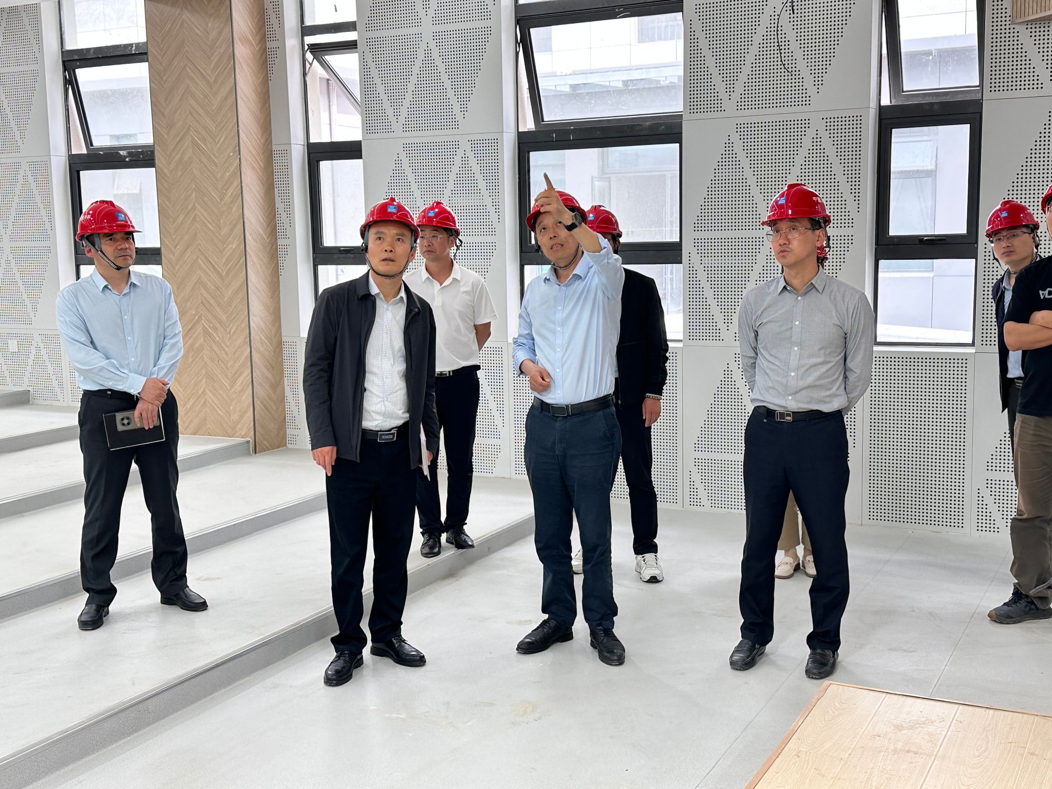 王延光实地调研了文科楼项目,重点察看了江宁校区文科楼项目大厅、多媒体教室、残卫、电梯井、中庭景观等建设情况,详细听取了各参建单位的工作汇报。他对工程收尾阶段重点提出三点要求:一是要把控时间节点,高质量推进项目建设;二是要严格安全管理,压紧压实安全责任;三是要树立精品意识,打造样板工程。