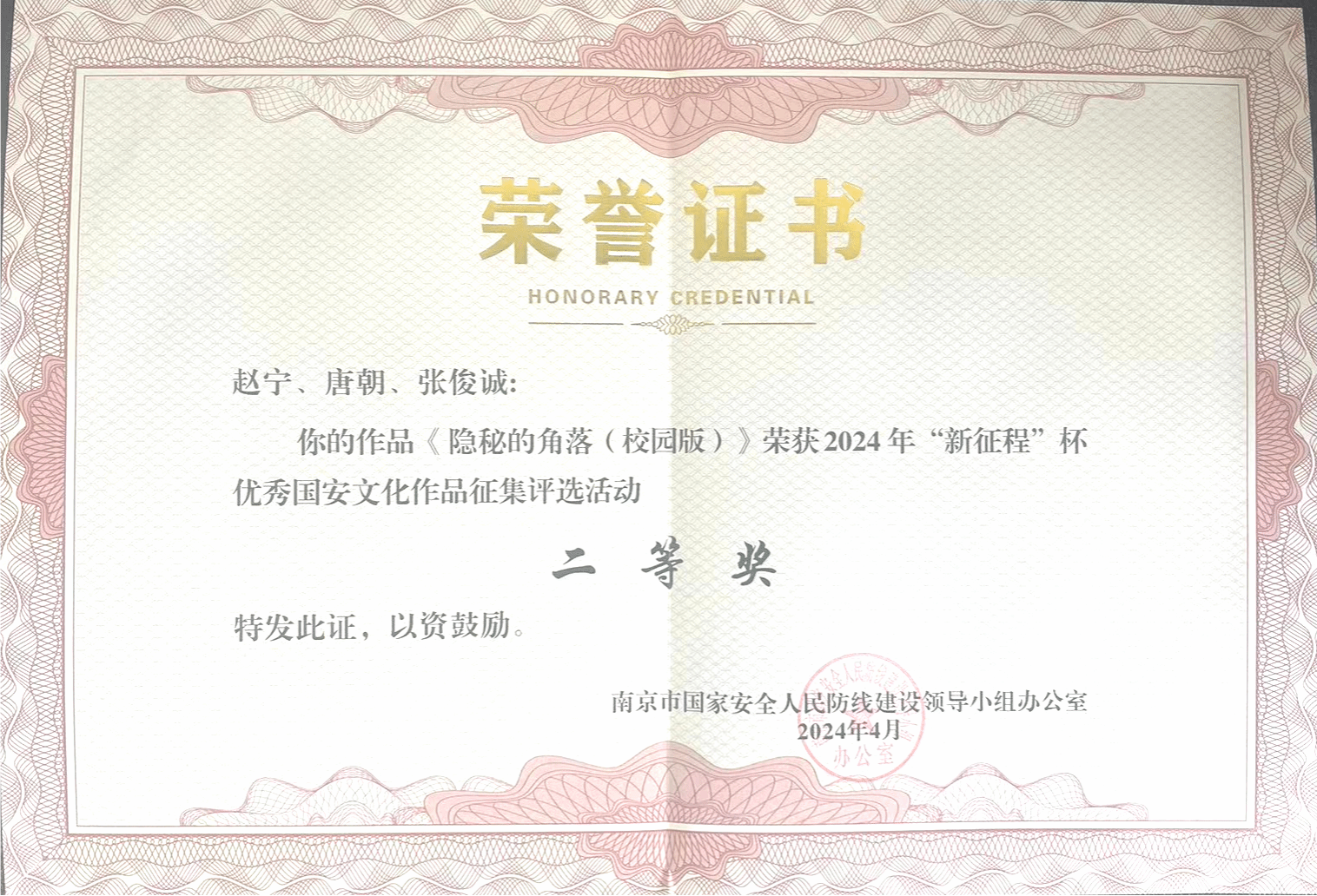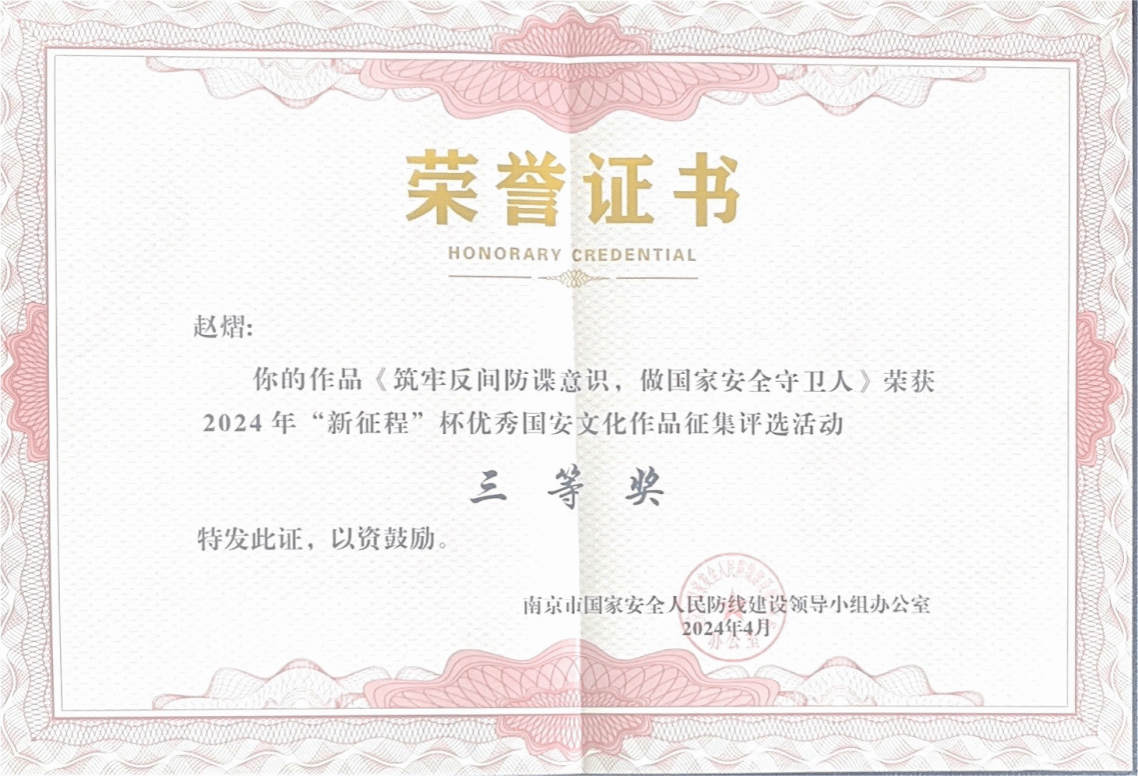 学生创作的《隐秘的角落》和《筑牢反间防谍意识,做国家安全守卫人》两个作品在全国“首届大学生《我眼中的国家安全》视频征集活动”中荣获优秀奖。