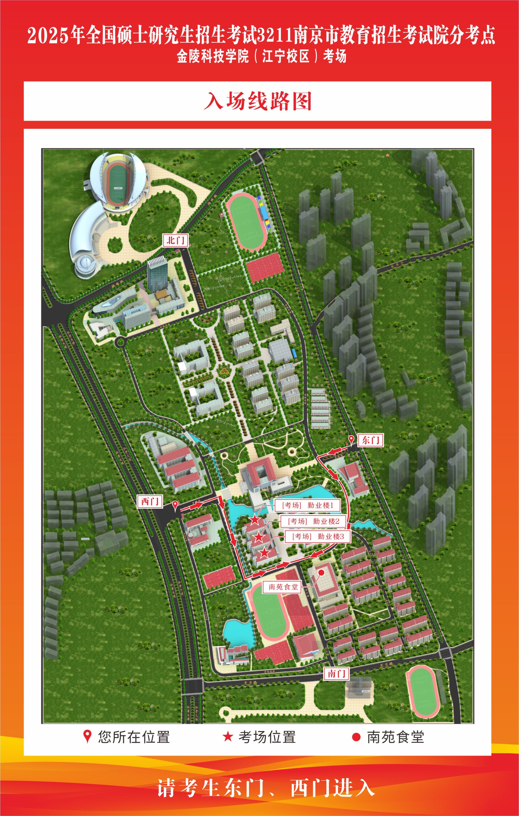 校内考点区域实行封闭管理,考生须通过校门初检(东门、西门)进入、考区智能安检门安检后方可进入考试封闭区域。非本校在读的考生凭准考证和有效身份证件进出校园。(入场线路图、考场分布图及考场安排索引表分别见附件1、2、3)