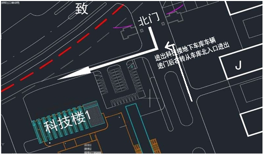 注意:北门进出车辆请从金陵北路东段通行(图一白色箭头进出方向);由金陵西路(工科楼东侧路段)前往科技楼车辆,请从玉兰路绕行(图二白色箭头为绕行方向);所有进入科技楼的机动车请从科技楼北侧路口进入(图三白色箭头为进入方向)。