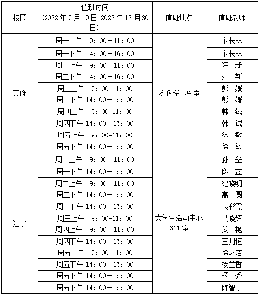 1.心理咨询预约电话:86188711;江宁校区预约地址:大学生活动中心310办公室(心理健康教育中心)。