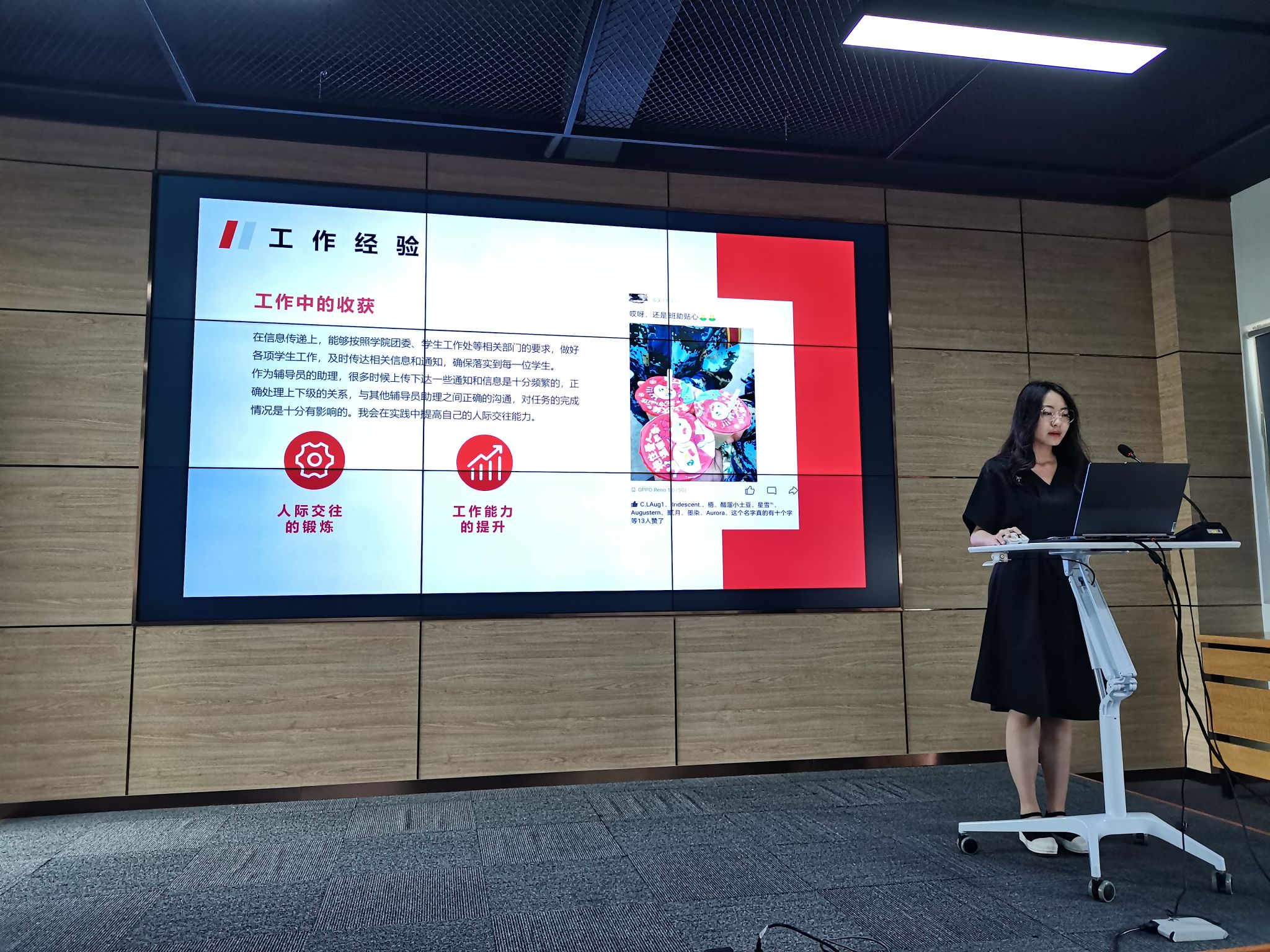 评审包括辅导员助理个人述职、学院考核小组测评、学生民主测评三个环节。23级辅导员助理依次上台进行述职。他们结合自己的工作实际,从班级管理、学风建设、思想引领、心理健康等方面进行了详细汇报,分析了工作中存在的不足和问题,并提出了改进措施和建议,同时还分享了自己在工作中的心得体会。他们认为,作为一名辅导员助理,要具备高度的责任心和使命感,要热爱学生工作,关心学生的成长和发展;要具备良好的沟通能力和协调能力,能够与学生、辅导员、任课教师等各方进行有效的沟通和协调;要具备较强的组织能力和管理能力,能够组织开展多种形式的活动;要具备良好的学习能力和创新能力,能够不断学习和掌握新的知识和技能。