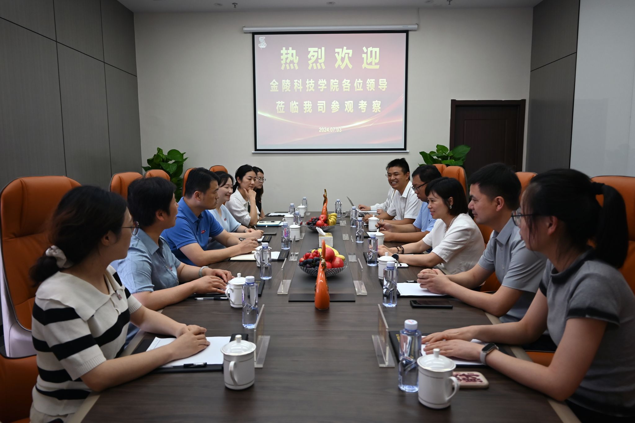 陈健书记一行首先详细了解我院历届毕业生在江苏博思通新材料有限公司的生活、工作和学习等具体情况,同时深入调研了企业的经营现状和人才需求状况。随后,与企业和我院2021届毕业生何玲、2024届毕业生李宗堂进行了深入的座谈交流。