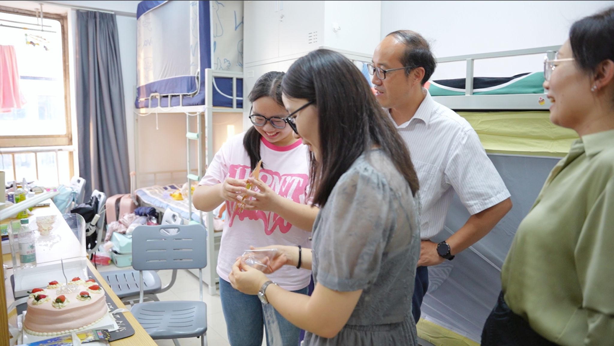 报到当天,建工学院党政领导亲临迎新现场慰问新生和家长,带来了学院对大家的关心、关怀,并与新生家长和现场工作人员进行亲切交流,对迎新工作进行了指导。迎新当天恰逢两位新生的生日,学院党委副书记郑庆秋带领新生辅导员走进宿舍慰问新生,并送上生日蛋糕和祝福,共享同一份喜悦与幸福。