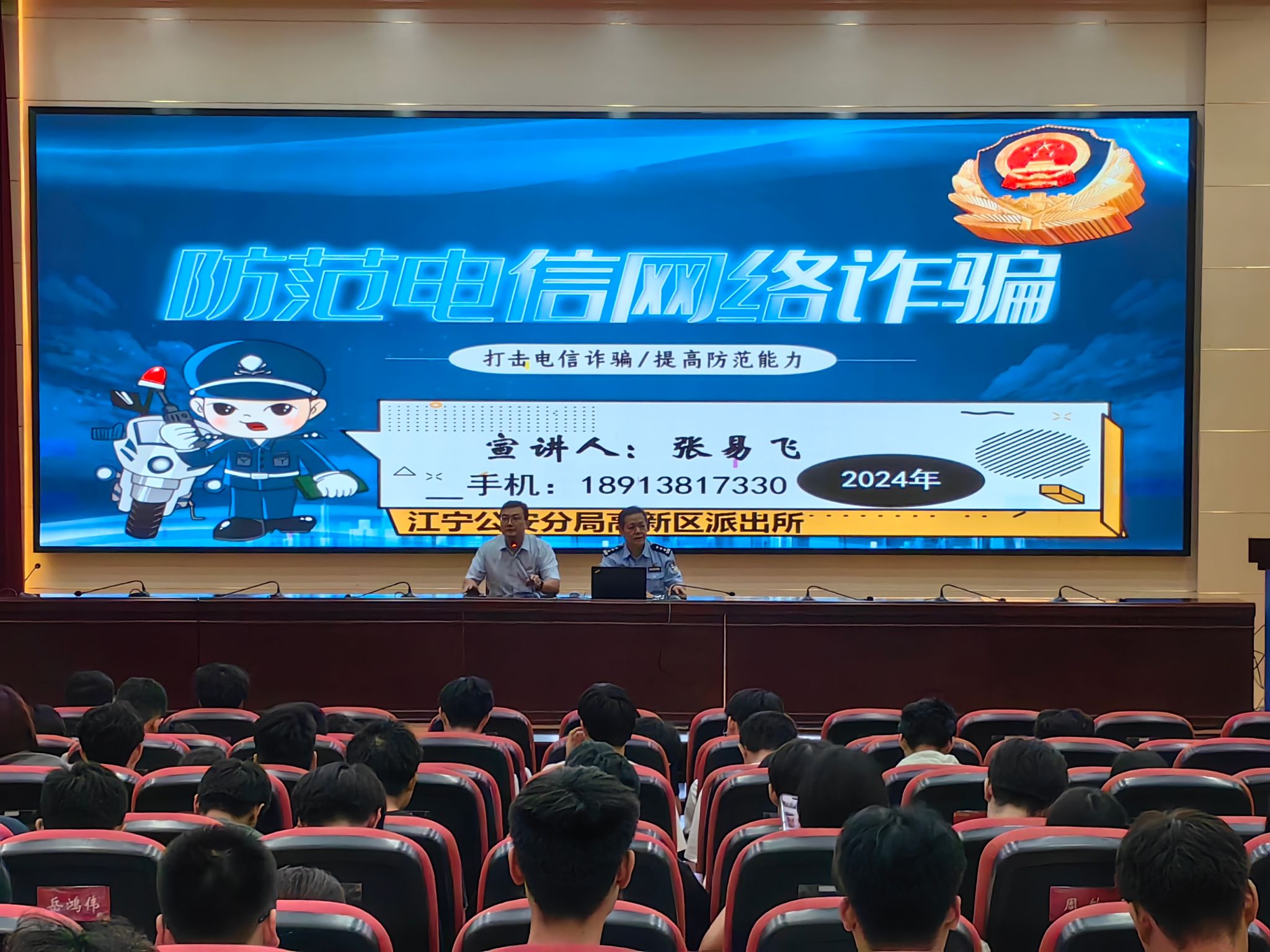 吴培生警官从诈骗数量和增长情况阐述了当前南京高校诈骗案件的发展形势,用真实形象的电信诈骗的案例,分析了电信诈骗给个人、社会以及国家带来的恶劣影响,让学生们深刻认识到电信诈骗的危害。