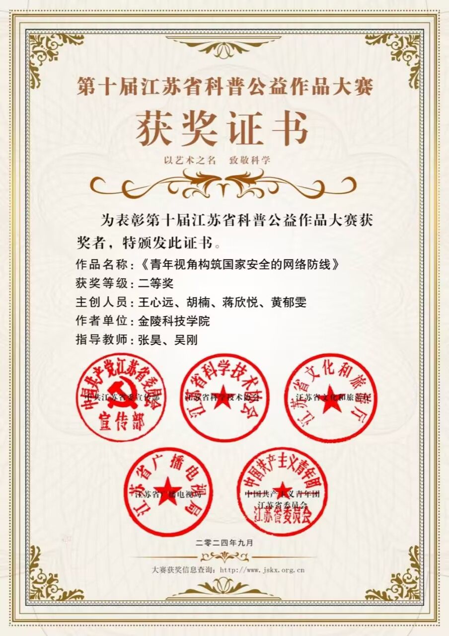 在刚刚结束的第十届江苏省科普公益作品大赛中,计算机工程学院学生主创团队拍摄制作的短视频《青年视角构筑国家安全的网络防线》喜获科普影视项目大学生组二等奖。