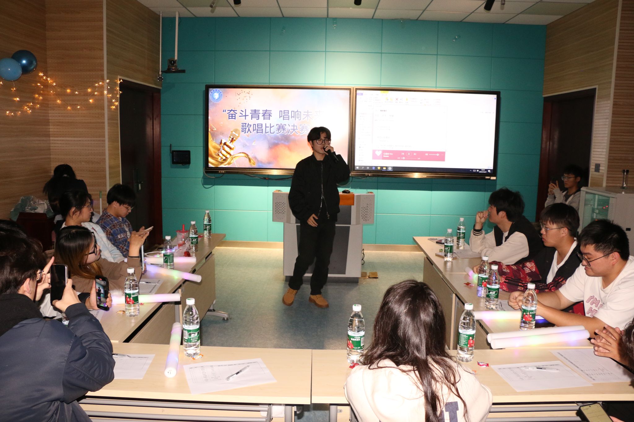 经过激烈的预选赛,共有9位选手脱颖而出,站在了决赛的舞台上。在决赛现场,九位参赛选手各放异彩,他们用歌声诠释青春,用旋律放飞梦想,为在场的师生带来了一场视听盛宴。黄国庆选手以《逆战》展现了青春的激情,吕东选手声情并茂歌唱《不染》,裘松涛选手表演的《才二十三》饱含对人生的感悟,高雪玲选手以从容与自信的态度歌唱着《特别的人》,带着夏日的炎热与秋天的深沉张翰宇选手表演《枫》,丁宁挥洒着青春带来《楼顶上的小斑鸠》,郑晓旭将京剧腔与流行音乐结合表演着《花田错》等等选手的倾情奉献。在场同学为选手给予欢呼与鼓励,以此表达对选手的喜爱。经过激烈的角逐,最终来自24智能科学与技术2班的丁宁同学以一首深情的《楼顶上的小斑鸠》征服了在场的评委和观众,荣获本次比赛的冠军。