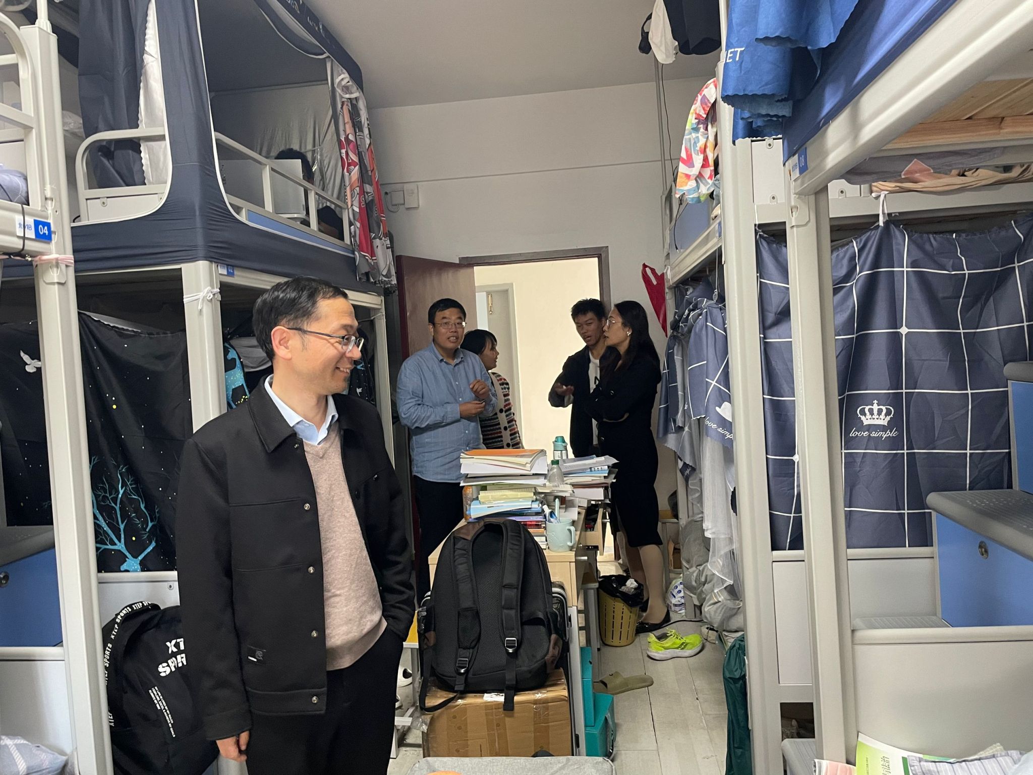 安全教育活动开始前,网通学院党委书记沐阳、院长王池社、副院长孟超等一行人来到了北区01A栋网通学院学生宿舍,他们现场检查了学生宿舍安全用电情况,要求学生提高宿舍安全意识,不在宿舍使用大功率违规电器,不私拉乱接。王院长现场询问了学生近期的学习情况,要求大家要养成良好的学习习惯,努力学习,创造良好的学习氛围。
