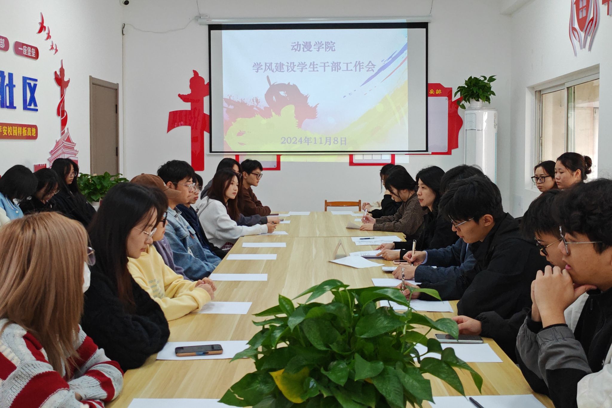 11月8日,动漫学院在南区07栋一站式学生社区,召开了审核评估学风建设学生干部工作会。学院党总支部书记赵宁,辅导员聂老师,各班班长及院学习部学生干部参加了会议。会上,辅导员通报了10月份学院课堂纪律自查情况,各班长就本班级上个月学风建设工作进行了交流。赵宁书记对大家的努力表示肯定,希望各班一要凝聚共识,带领全班同学加强对审核评估冲刺阶段学风建设重要性的认识。二要强化措施,全员联动加强班级课堂纪律建设,组织同学进一步认真学习审核评估应知应会内容。三要勇担责任,扎实做好日常管理和学生意见收集梳理工作,及时向学院反馈,共同营造紧张活泼的优良学风氛围,提升学生满意度。