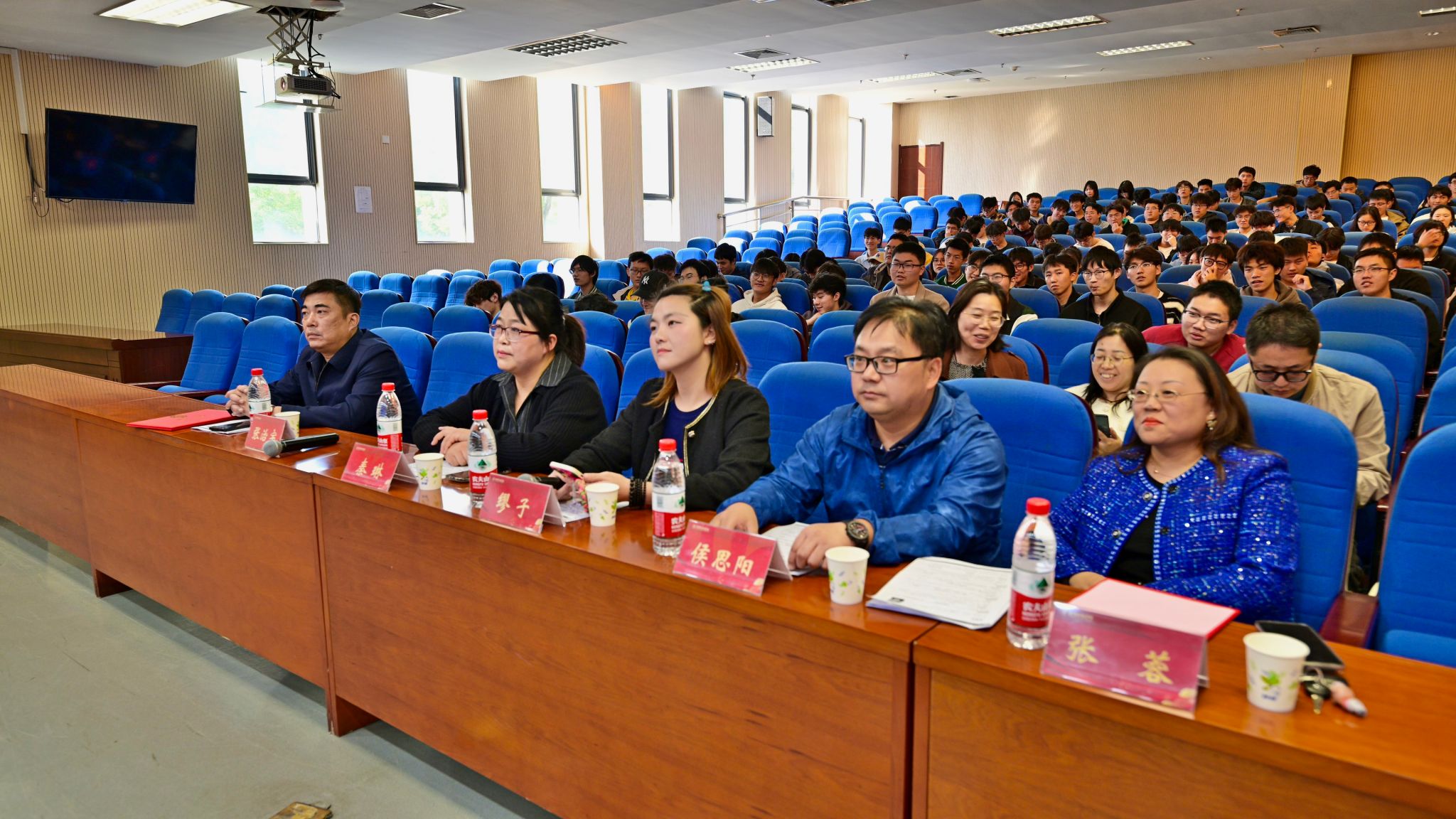 本次活动邀请到了江苏六维度教育科技有限公司首席培训师侯思阳、江苏思妙林人力资源有限公司总经理缪子、江苏省内事业单位业务主管领导秦琳、南京西文人才信息咨询有限公司董事张治宇四位专家作为指导嘉宾,院党委副书记张蓉、全体辅导员老师及12名毕业生代表参加模拟面试活动,100多名学生现场观摩。本次活动由辅导员邓抒扬老师主持。
