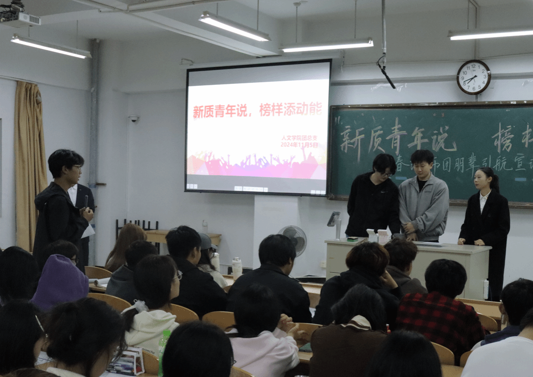 115日晚,在幕府校区图教楼B305B405教室,人文学院举办了“新质青年说,榜样添动能”第三期青春讲师团经验分享活动。人文学院团总支书记高欢欢,2024级全体新生参加了活动。
