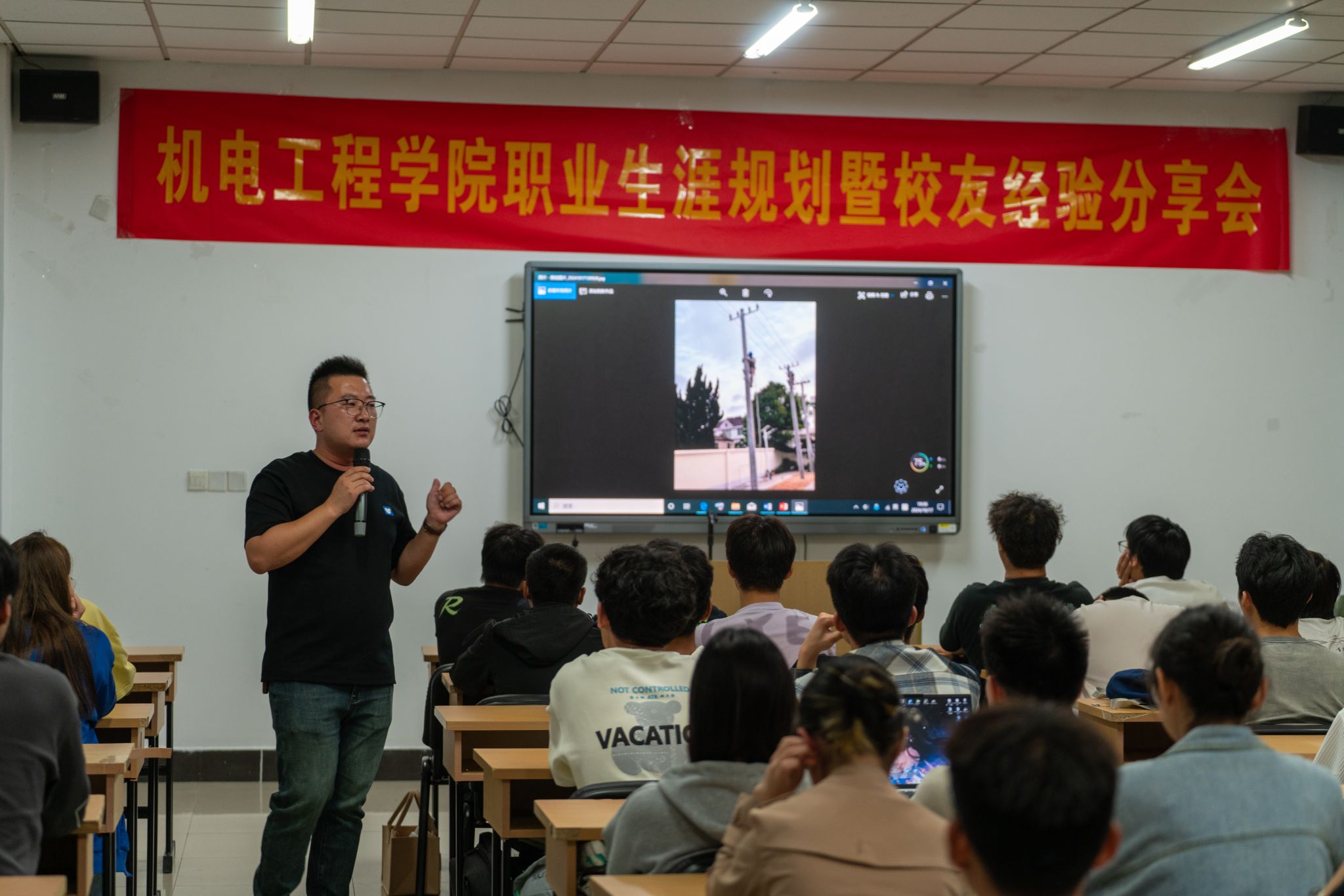 李泓昆以“浅谈职业规划”为题,从如何设定明确职业目标、适应职场需求、提升简历和面试技巧等方面展开讲述,并结合个人成长经历,为机电学子分析未来电气专业的发展趋势。他鼓励同学们提高终身学习能力,树立合理的中短期目标,做好充分的行业研究,在技术快速发展和市场竞争加剧的时代实现个人价值和社会贡献。随后,李泓昆分享了职场新人成长路径的建议,提醒大家要保持谦逊学习的态度,勇于接受挑战,以孺子牛、拓荒牛、老黄牛的精神来实现自身价值、创造美好的人生。