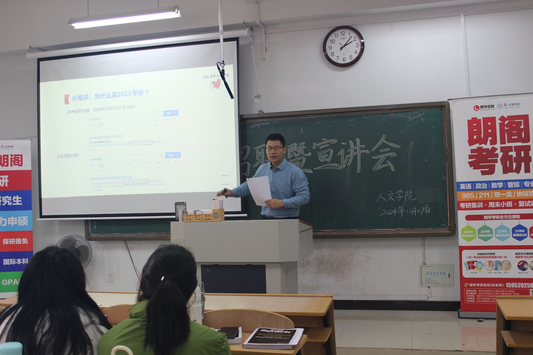 为了帮助大学生做好职业生涯规划,助力2025届毕业生顺利就业升学。11月27日下午,在幕府校区图教楼210,人文学院校企合作单位朗阁教育集团举办了秋季就业升学宣讲会,朗阁教育集团(朗学考研)总经理张引成、人事总监刘晓梅、高级留学顾问高雷担任主讲,全院100余名学生代表参加了宣讲会。